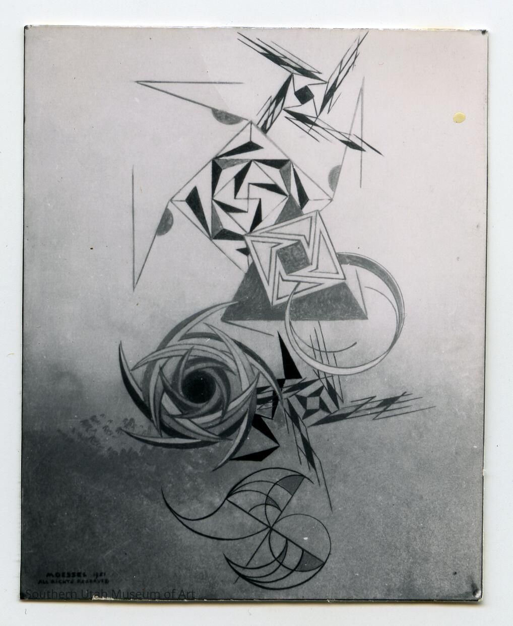 Although this piece is abstract in its content, it is far from abstract in context. Here, Moessel returns to logarithmic spirals, the overlapping crescent shapes featured in "Atom of Consciousness," as well as the square shapes that resemble the tile designs in "Susanna and the Elders."Label Type