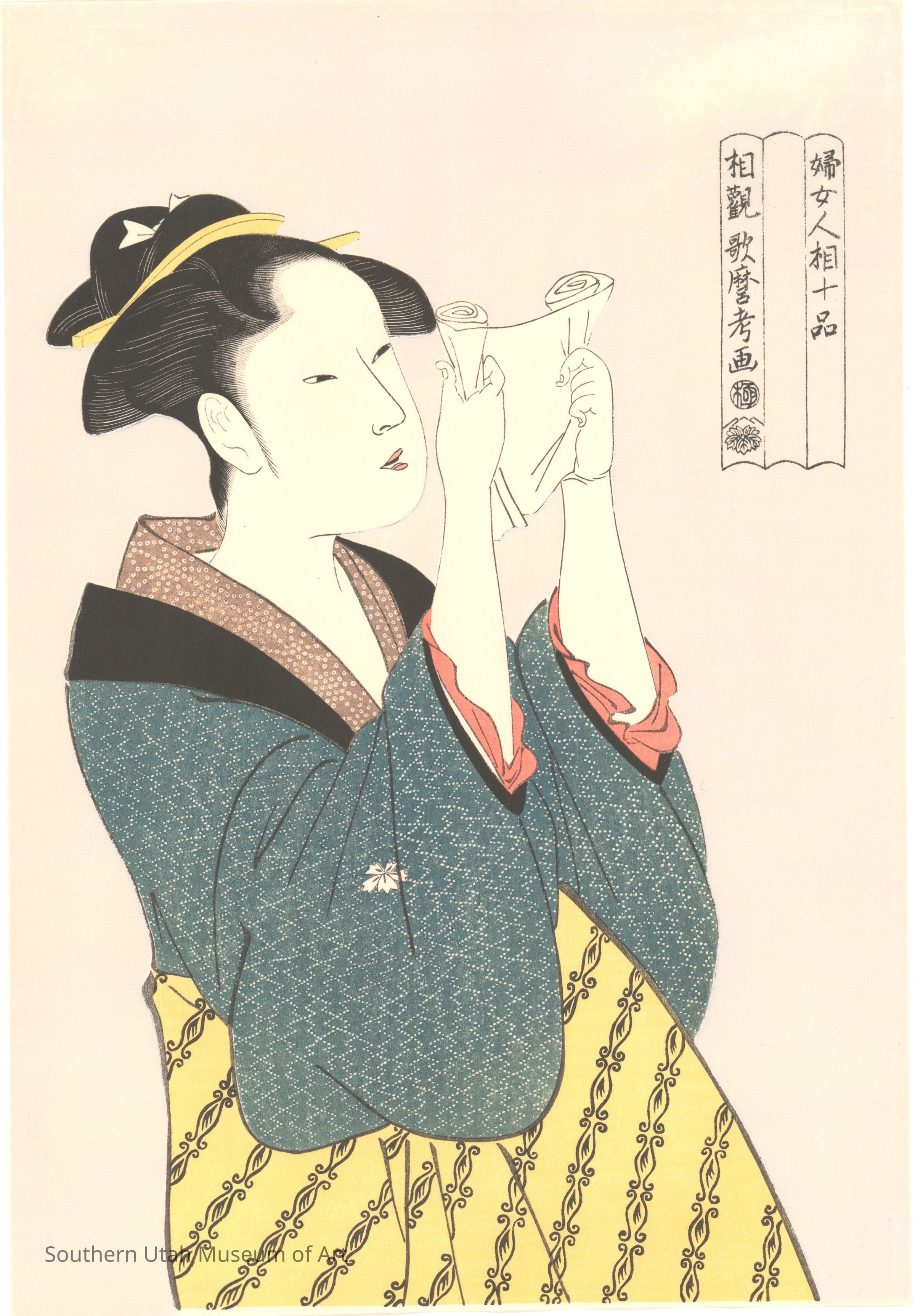 Utamaro’s series “Ten Classes of Women’s Physiognomy” claimed to identify the different types of women, buying into the pseudoscience of physiognomy, the supposed art of judging a person’s personality and character from facial features. This print lacks a title, which would typically be in the middle section of the cartouche on the right, but it has been given the descriptive name Woman Reading a Letter by scholars. The subject’s shaved eyebrows and blackened teeth indicate that she is a married woman; the intent way in which she is reading the letter, as well as the common themes of ukiyo-e (pleasure, entertainment, and drama), suggest that she is reading a love letter. Additionally, this print features the technique of dusting ground mica on the background of a print. The white ground mica (shiro-kirazuri) on this print gives off a breathtaking pearlescent shimmer.