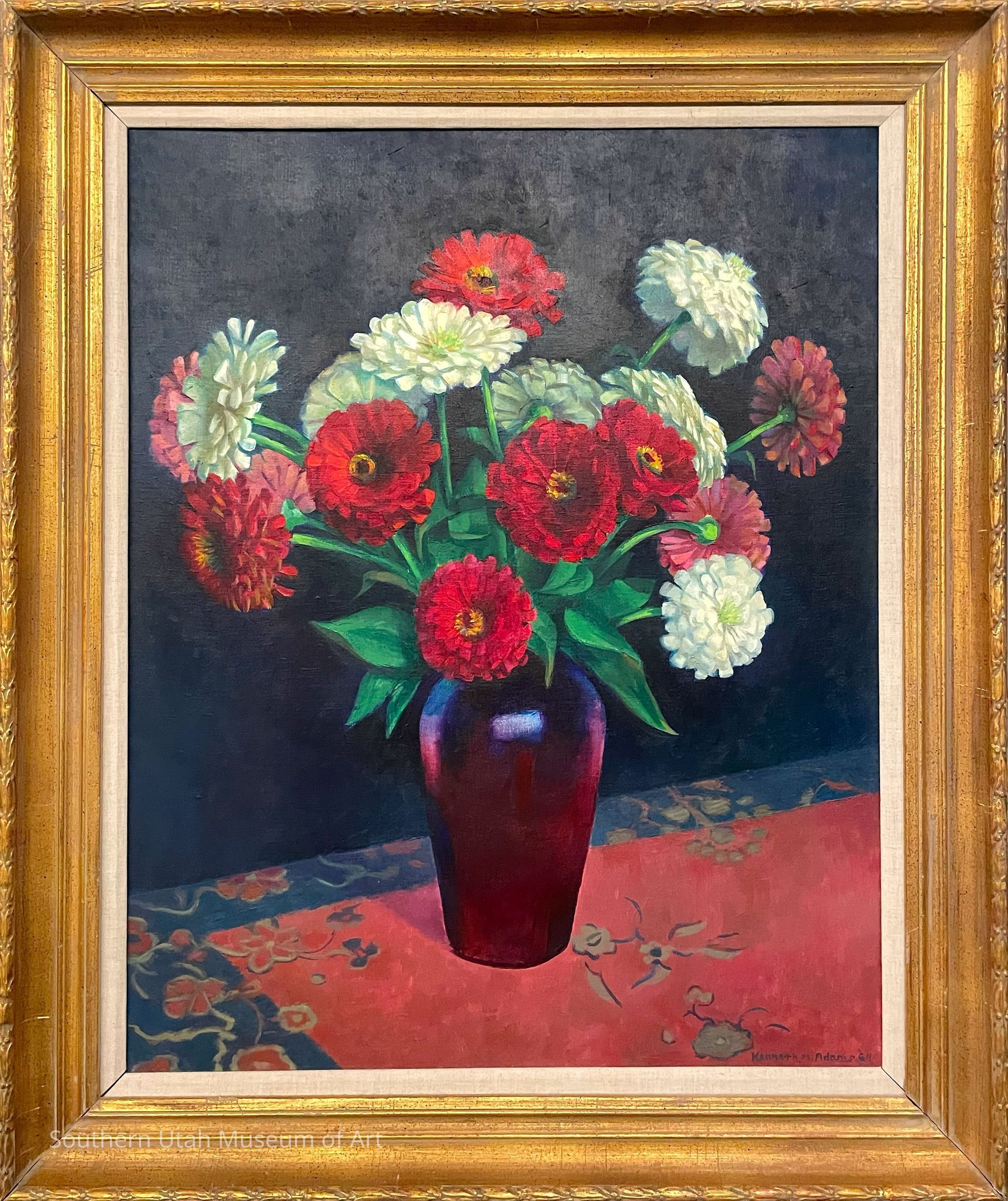 "Zinnias in Burgundy Vase" oil painting by Kenneth Adams