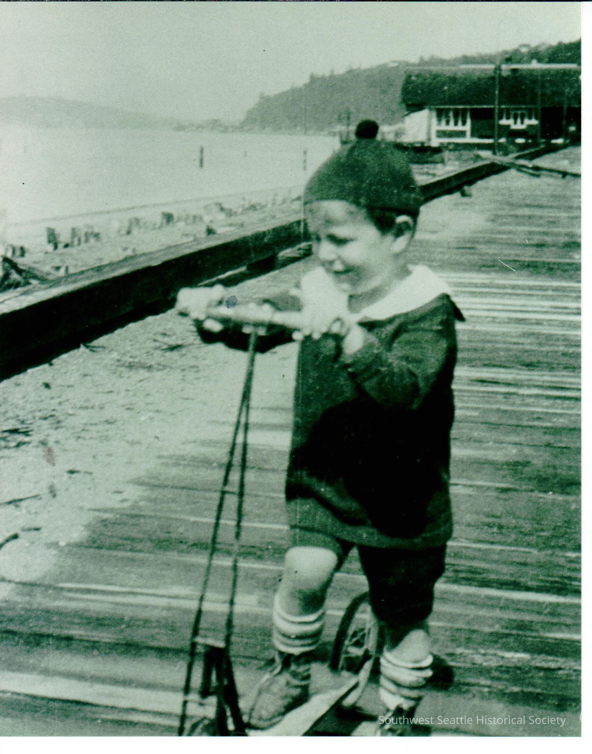 A small child riding a scooter along the boardwalk at Alki beach. Duwamish Head can be seen in the background.