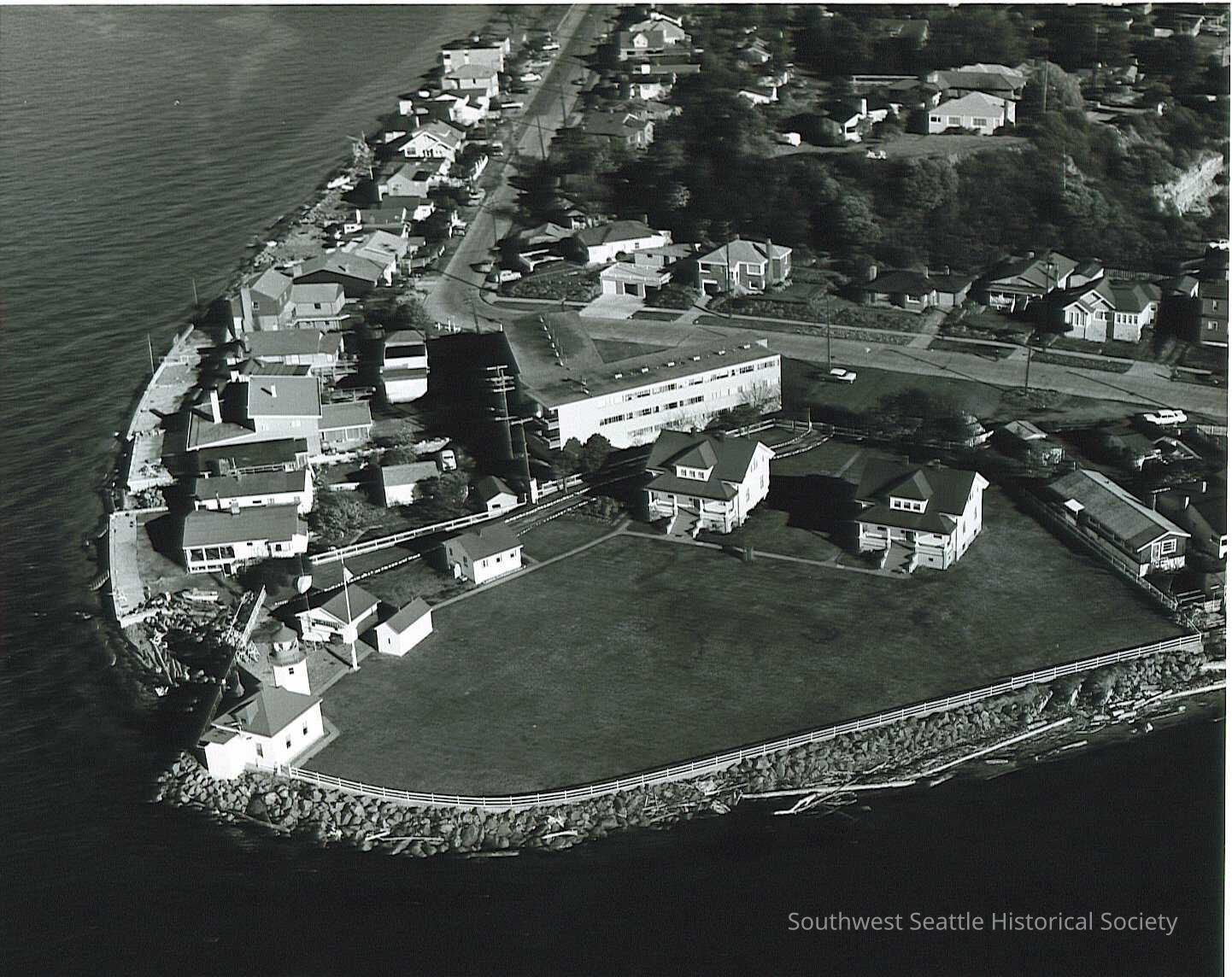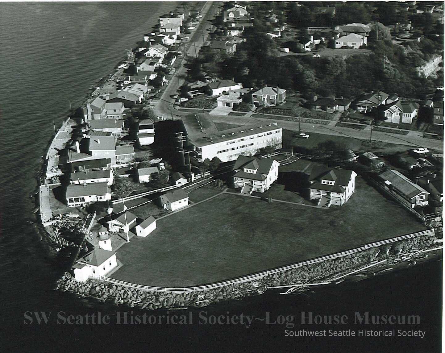B&W aerial photo of Alki point lighthouse and surrounding area water, homes, and road. Lighthouse is in lower left. Shows the lighthouse keeper's two houses and the large lawn out front. Written in black pen on back "Alki Point Light House -"