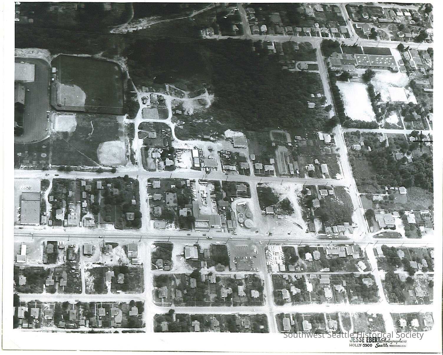 B&W aerial view of neighborhood - looking east with White Center Playfield, upper left; Mt. View School, Upper right; 16th Ave SW lower centerCollection
