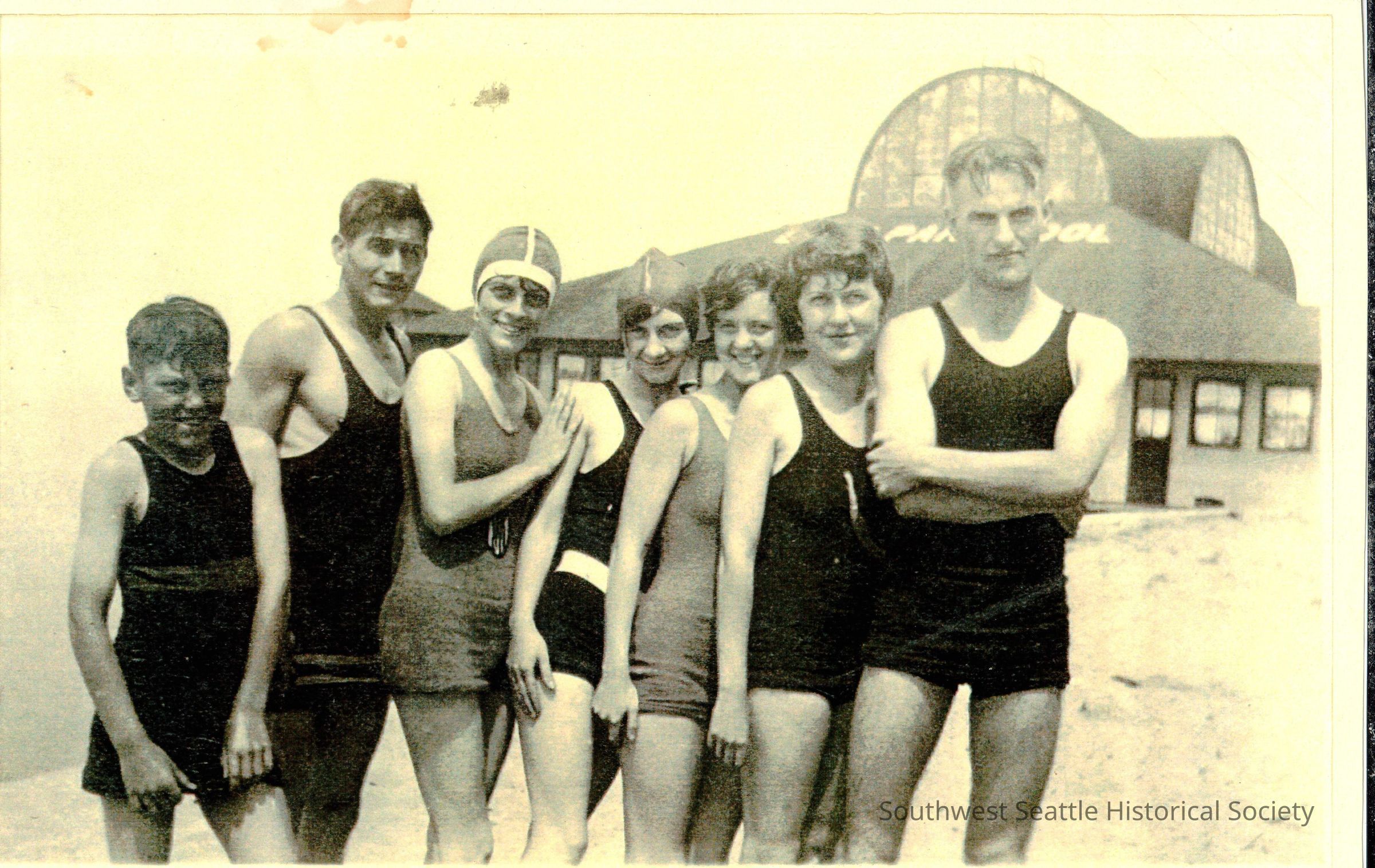 Seven bathers standing in front of the Luna Park Pool. Photograph taken sometime in the 1920's