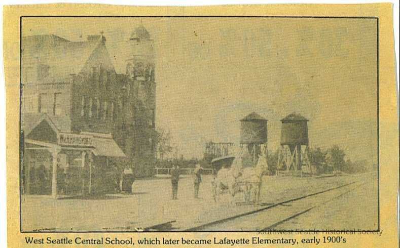 Newspaper clipping "West Seattle Central School, which later became Lafayette Elementary, early 1900s"