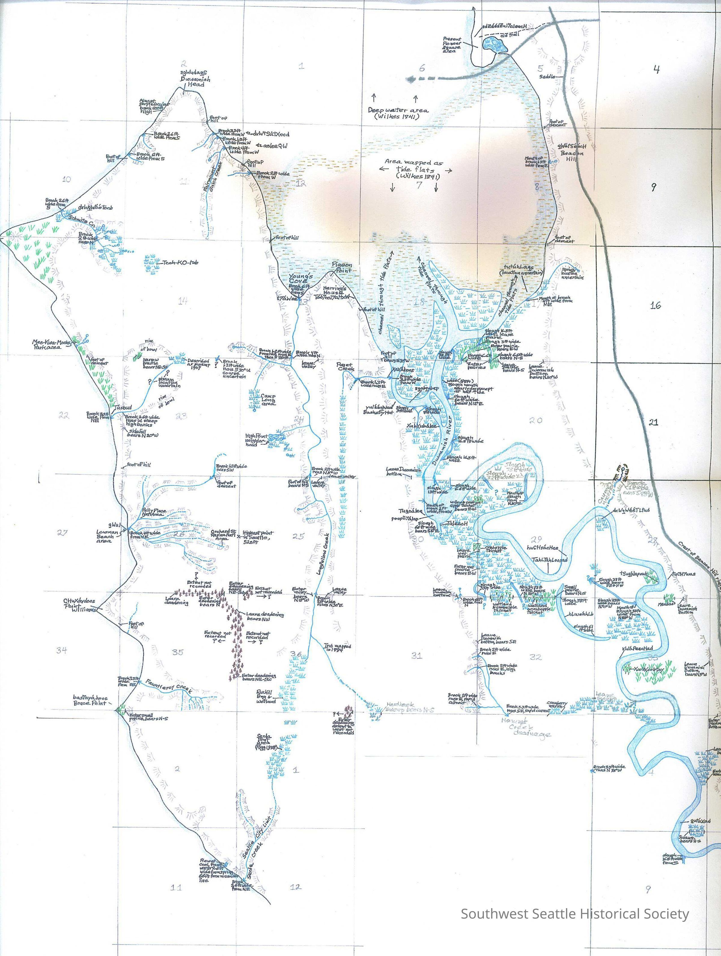 Map of southwest Seattle with historic and current waterways marked