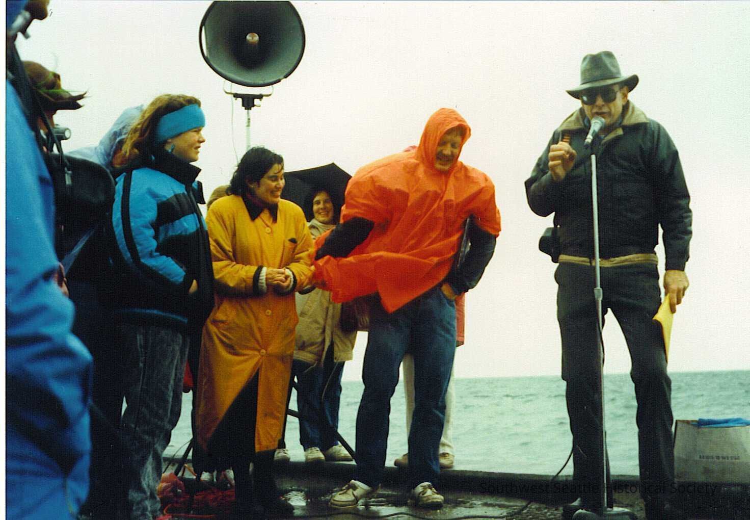Color. Ben Boren, great great grandson of Carson Boren, one of the 23 members of the original Denny Party speaks during the November 11, 1989 centennial finale at Alki Beach.