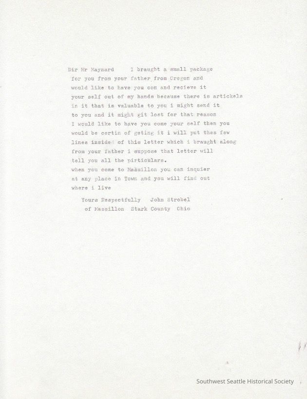 Letter from John Strobel, in Massillon, Ohio, to Mr. Maynard (Henry Maynard). John Strobel requests that Henry come to him in Massillon, Ohio to retrieve the items he has brought from his father, David Maynard.
