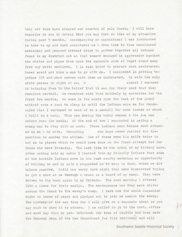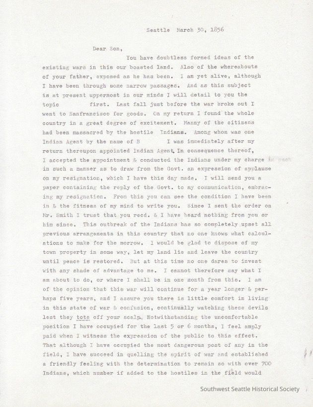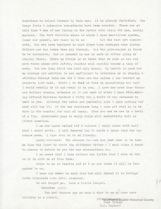 Letter from David S. Maynard, in Seattle, to son (Henry Maynard). Maynard describes the war and his appointment as Indian Agent, and his gathering of the friendly Indians, in hopes they would remain neutral in the war. He describes at attempt on his life by some hostile Indians. Maynard mentions four man of war ships in the harbor. He indicates that as soon as the war is over, Seattle will rapidly grow. Maynard describes the Indian attacks and killings and unrest in the area.