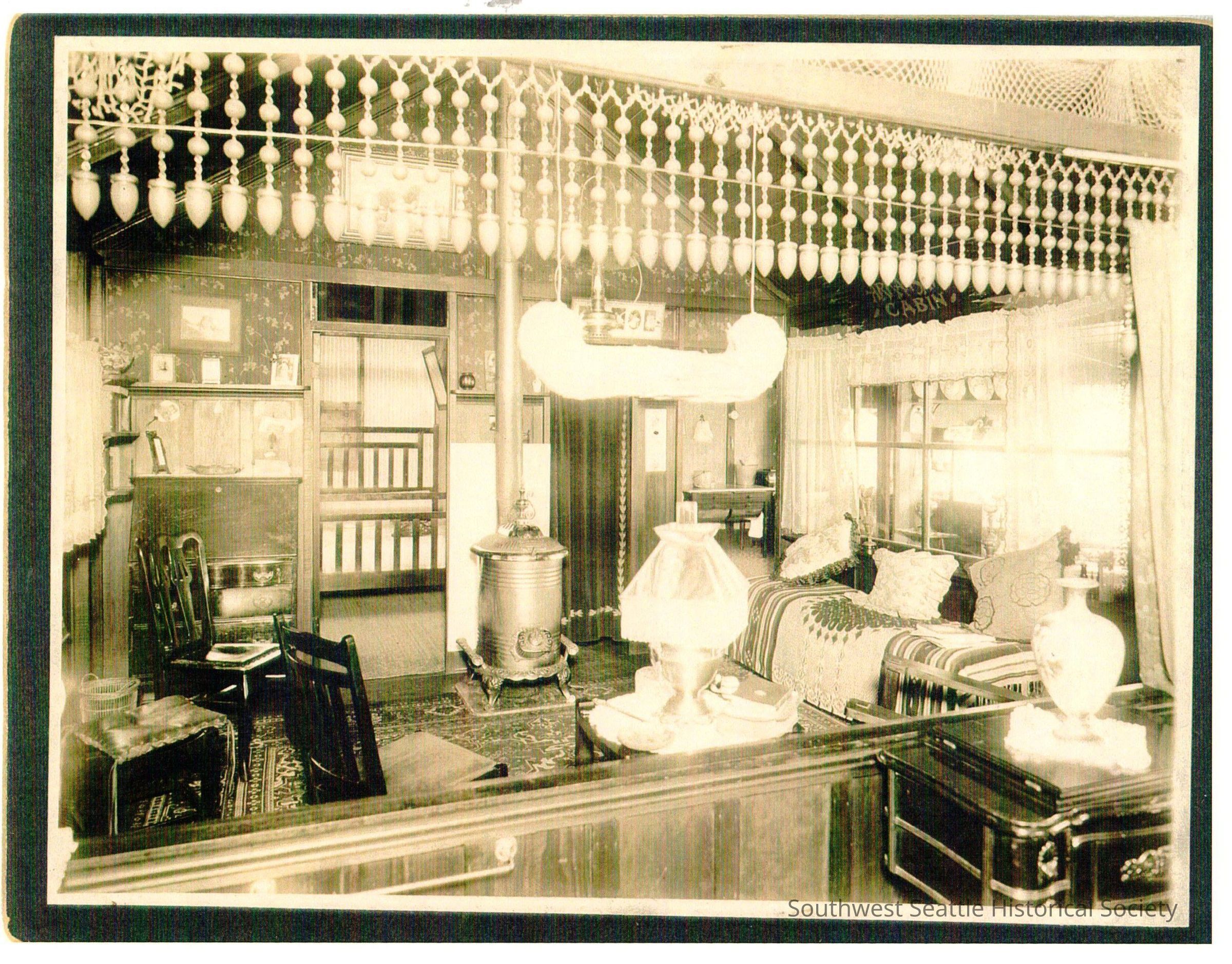 Interior view of the Arkansaw cabin showing the main room with several chairs, sofa, and a heating stove. Through the doorways on a the back wall, two additional rooms can be seen - a kitchen and a bedroom. Through the window the back deck is visible.