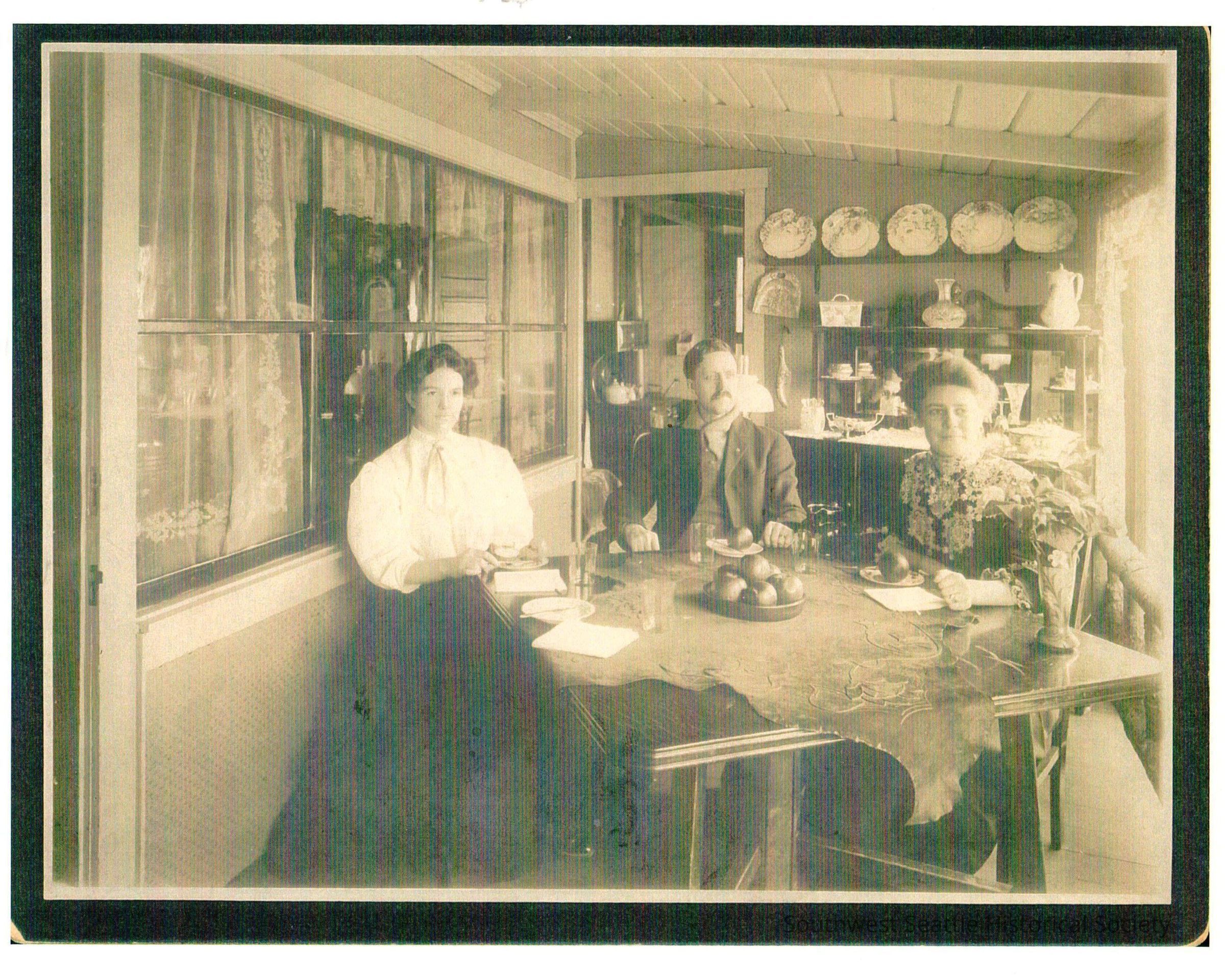 View of the back deck of the Arkansaw Cabin. Two women and a man are sitting around a table and looking out towards the sea. There is a plate of fruit and a vase with flowers on the table, as well as a display of plates and other dishware on shelves behind them. Through an open door, a kitchen area can be seen in the background.
