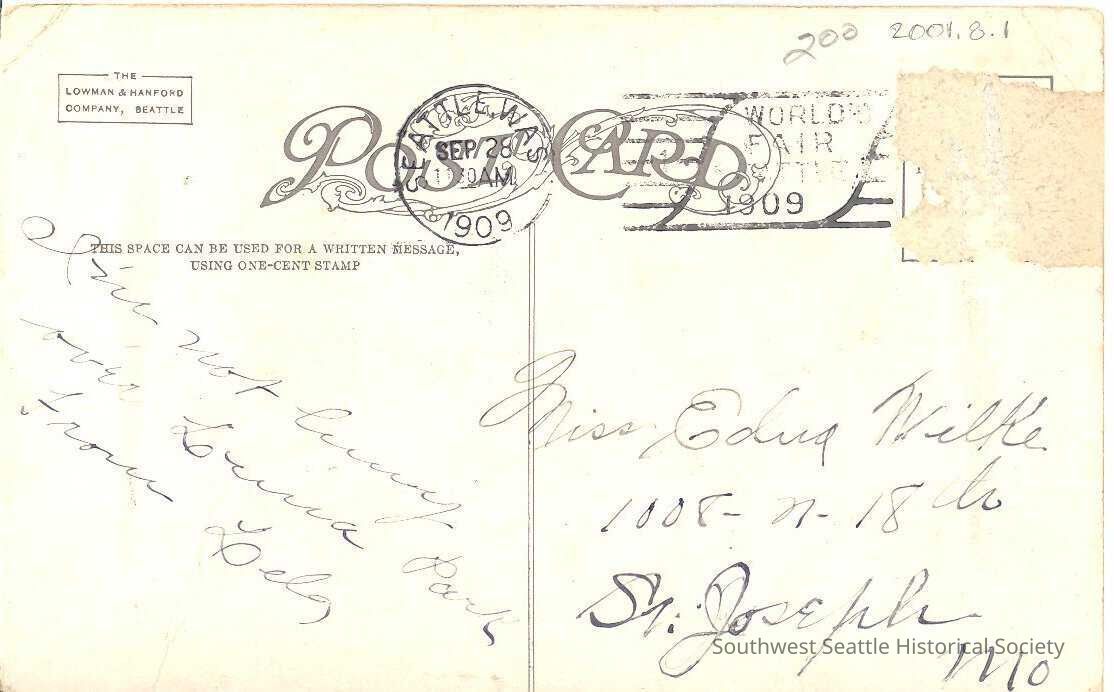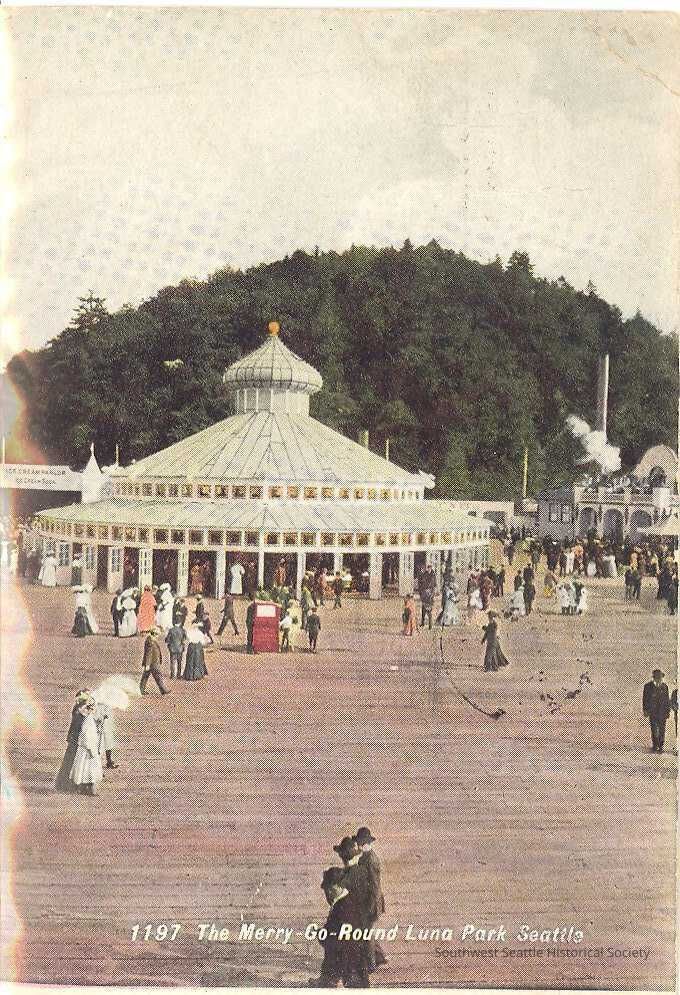 "1197 The Merry-Go-Round Luna Park Seattle" colorized postcard, sent 9/28/1909 to Miss Edna Wilke 1008 S 18th St. Joseph, MO...
