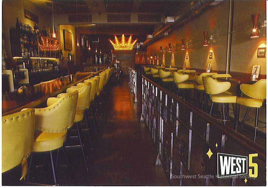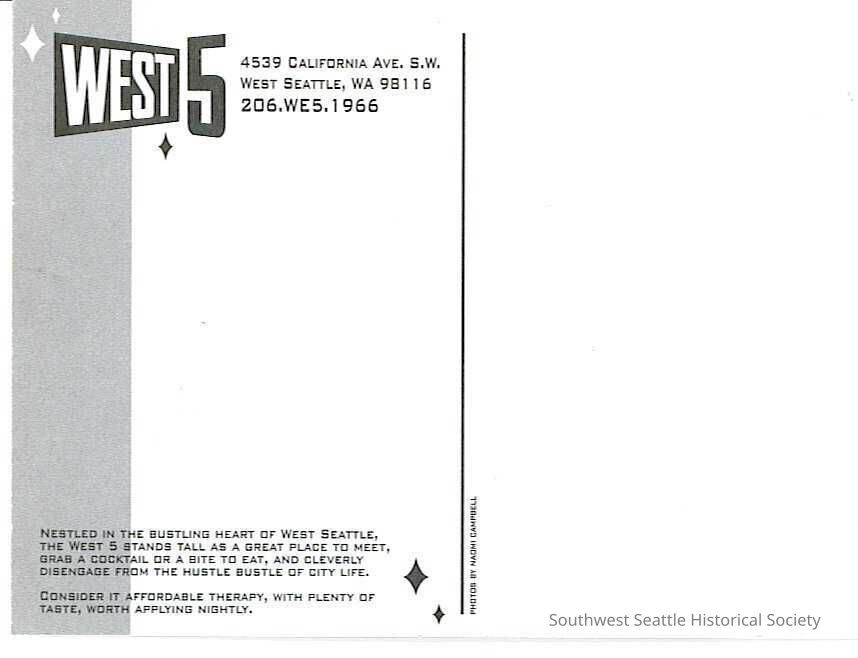 Postcard from West 5, an Alaska junction restaurant. Opened c.2000, this card was given to customers in 2007. Address and phone number of West-5 on postcard: 4539 California Ave SW; 206.WE5.1966. Image of interior of restaurant, bar on the left, seating on right. Giant crown neon light on wall in back. West Seattle Alaska junction business logo sign.