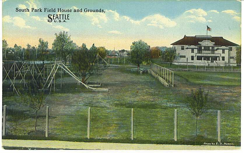South Park Field House and playground. Swings, ball field Field House. scan of Lowman & Hanford Co. #3120, photo by F. H. Nowell.