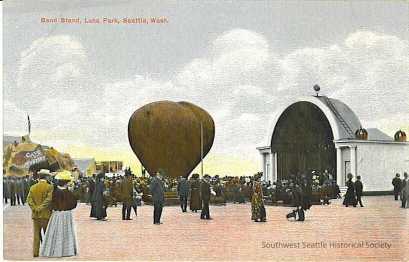 Scan of Luna Park postcard. Portland Postcard Co. #5100. Printed on front: "Band Stand, Luna Park, Seattle, Wash." showing hot air balloon at band stand. Cave of Mystery visible on left, center, a band is playing in the band stand shell, many people seated in chairs in front of stage. ladder on roof of shell; some sort of light visible on top too.