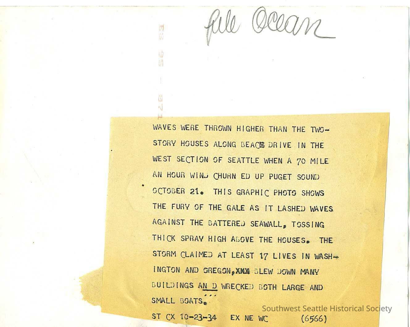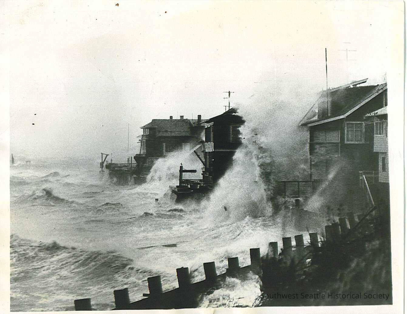 "Waves were thrown higher than the two story houses along Beach Drive in the west section of Seattle when a 70 mile an hour wind churned up Puget Sound on October 21. This graphic photo shows the fury of the gale as it lashed waves against the battered seawall, tossing thick spray high above the houses. The storm claimed at least 17 lives in Washington and Oregon, blew down many buildings and wrecked both large and small boats." storm