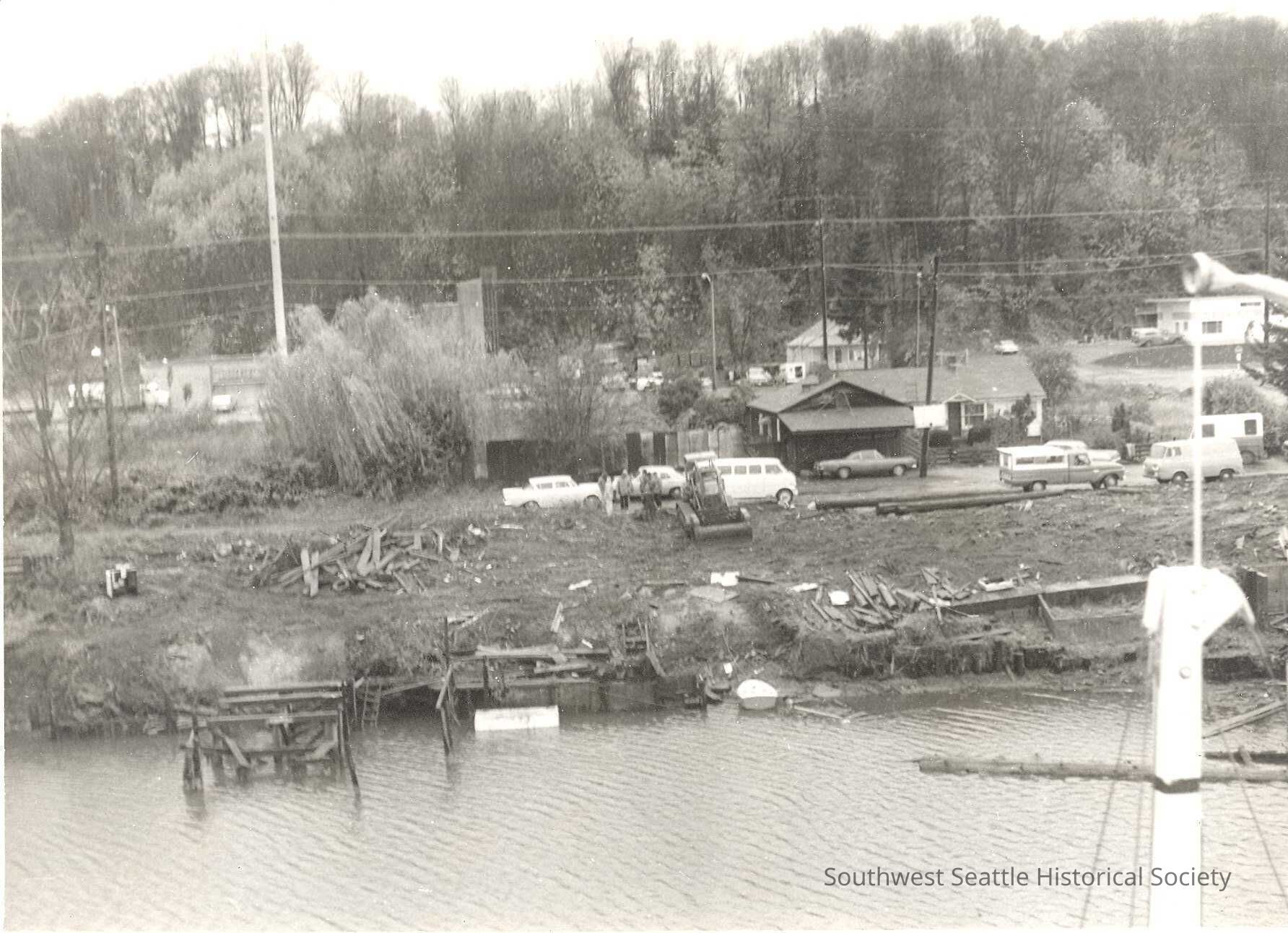 BW photo back labeled "DWBOA - Tim Kelly, Nov. 8, 1975, 12th Ave SW - Edmonds to R" House along Duwamish River