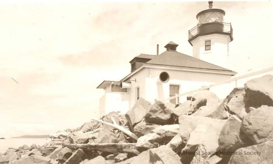 Black and white. Print, Alki Point Lighthouse. Scan located on F drive Oversize print, some discoloration and folding