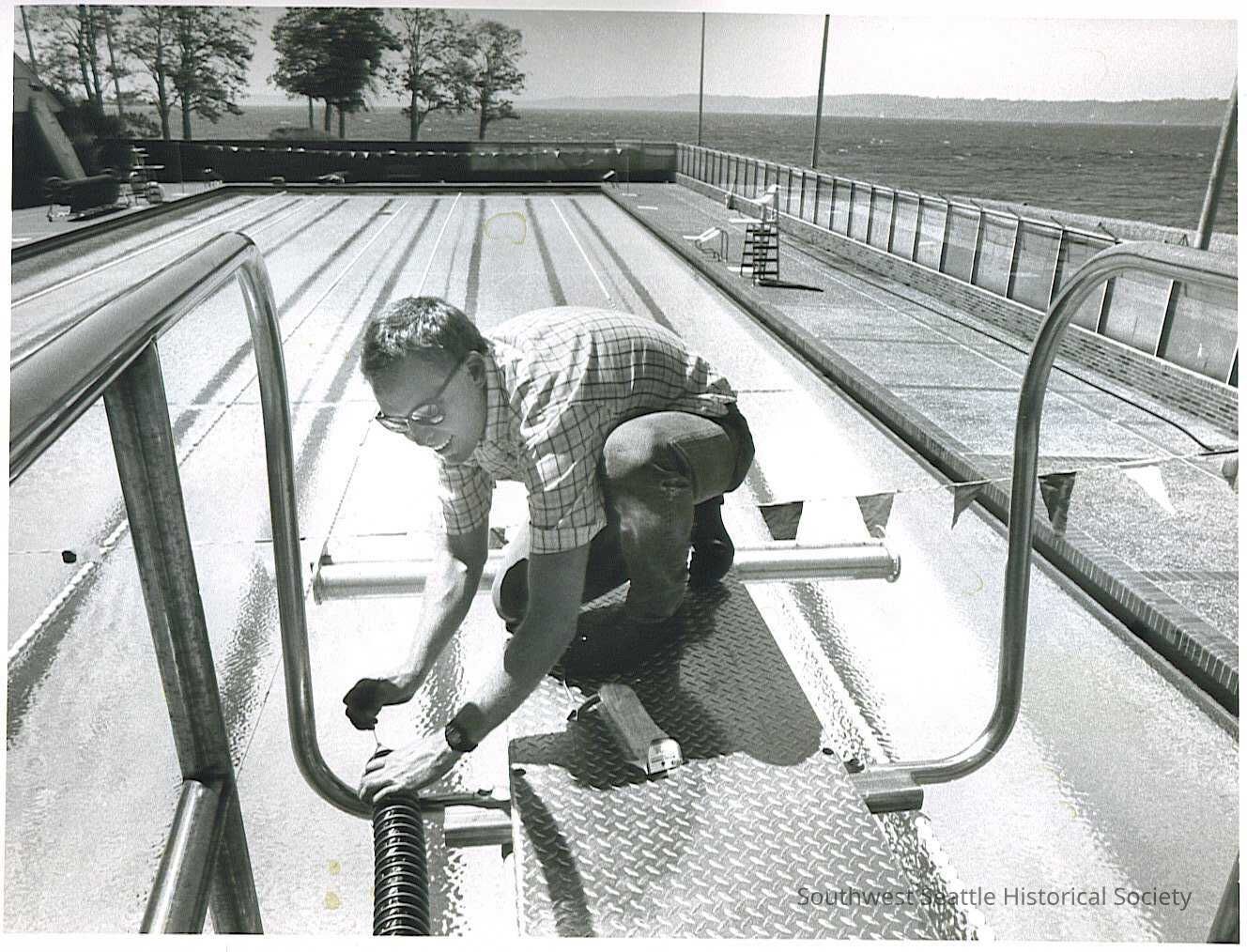 BW photo of man doing maintainence at an outdoor swimming pool. Likely Colman Pool.