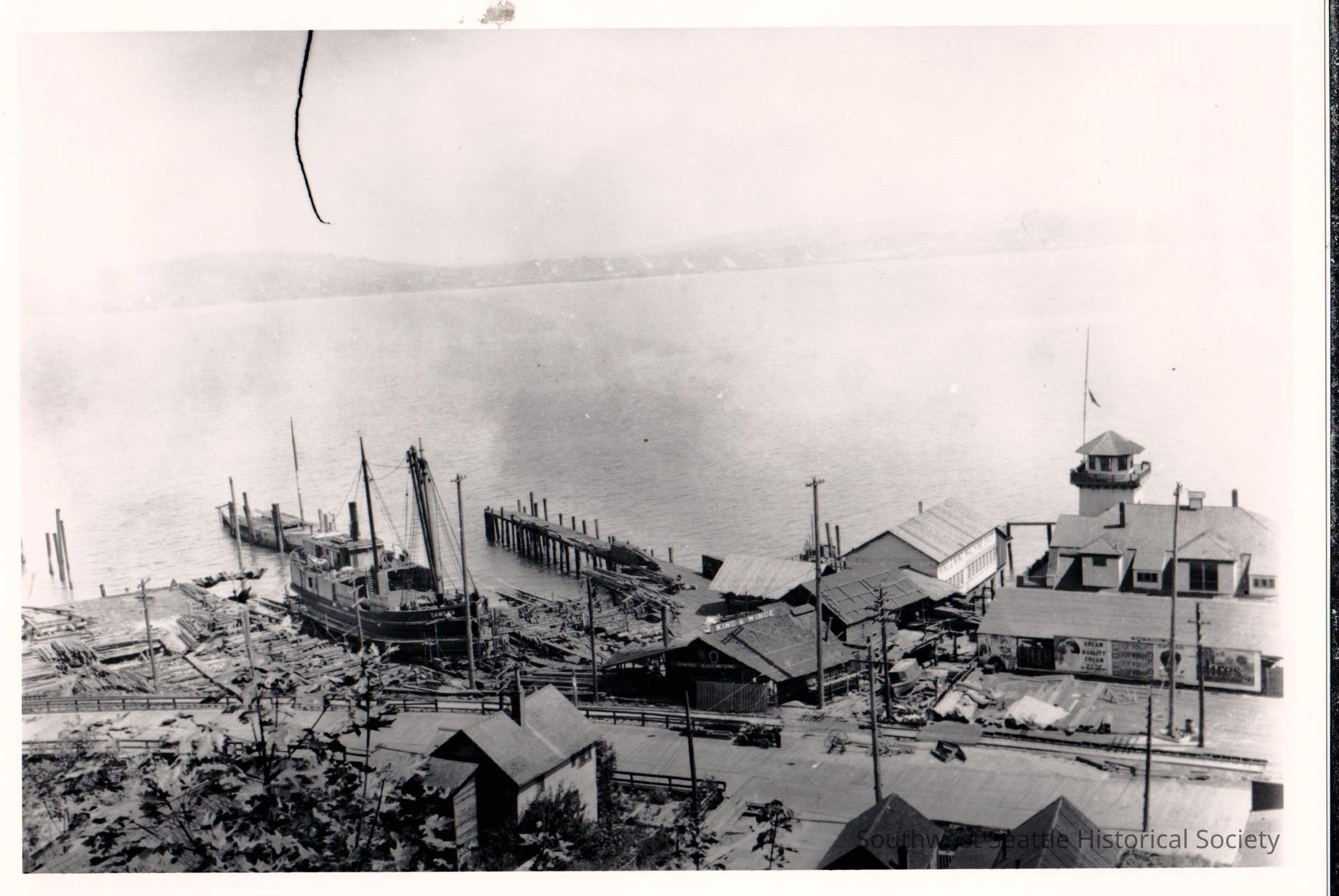 A view looking down from the bluff at the King and Winge shipyard on Alki. There is a cluster of buildings including a machine shop and blacksmith, as well as a large vessel called the Samson at the dock. On the wall of the large building to frame right is a row of what appears to be advertisment signs