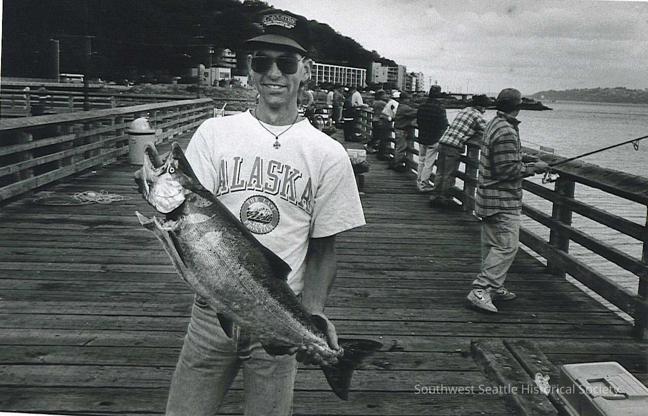 BW photo of man wearing an Alaska t-shirt holding a salmon. Behind him rows of people fishing off the pier near Salty's on Harbor Ave.