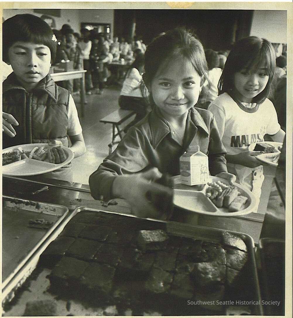 BW photo - 3 asian children in school lunch line, at tray of brownies
