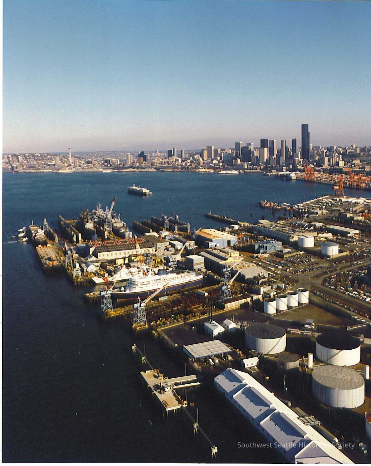 Color photo of the Port of Seattle, downtown skyline, space needle, Puget Sound in background