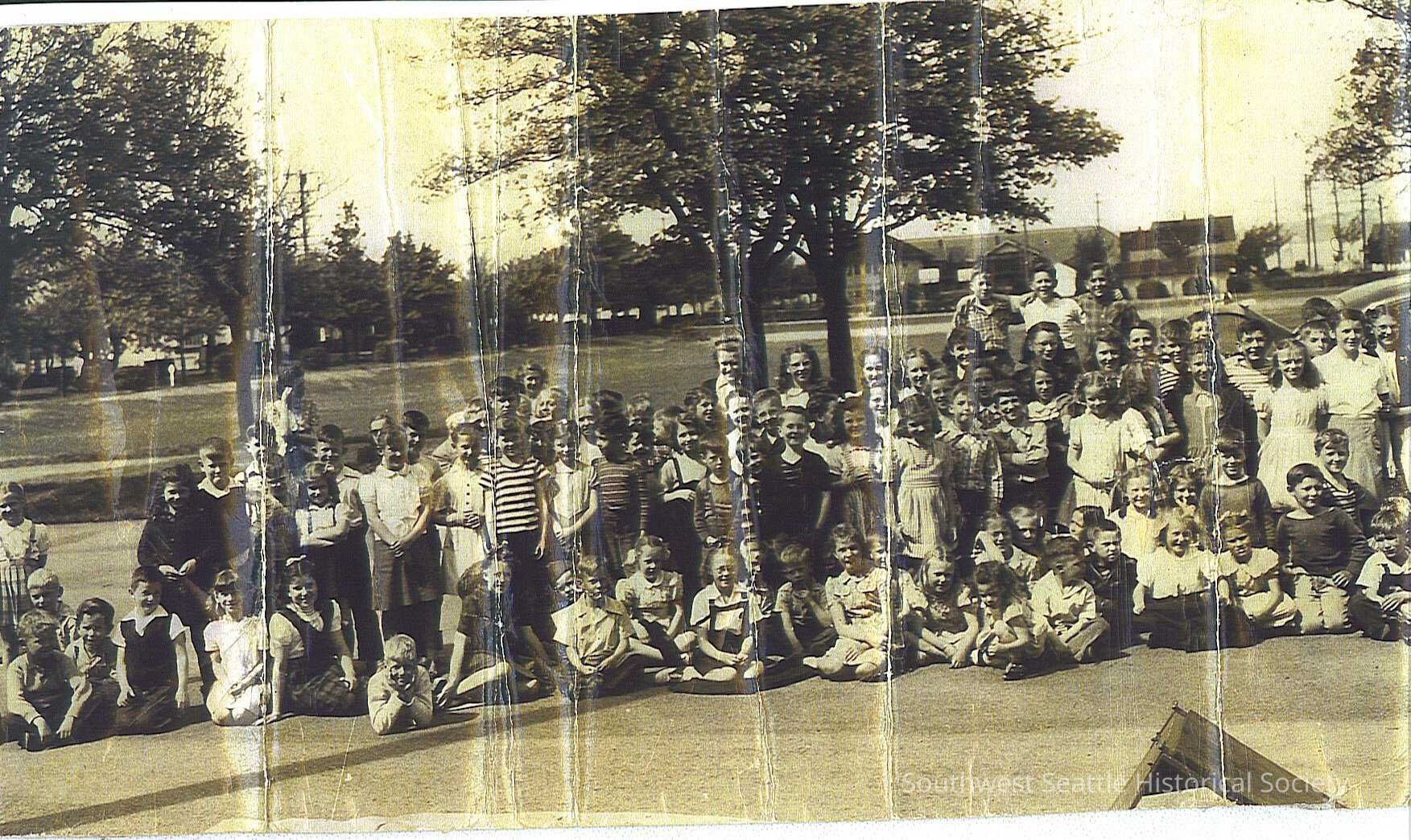 2 copies of same photo Partial panaoramic shot of Alki Elementary School Class, 1910-1920's