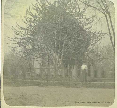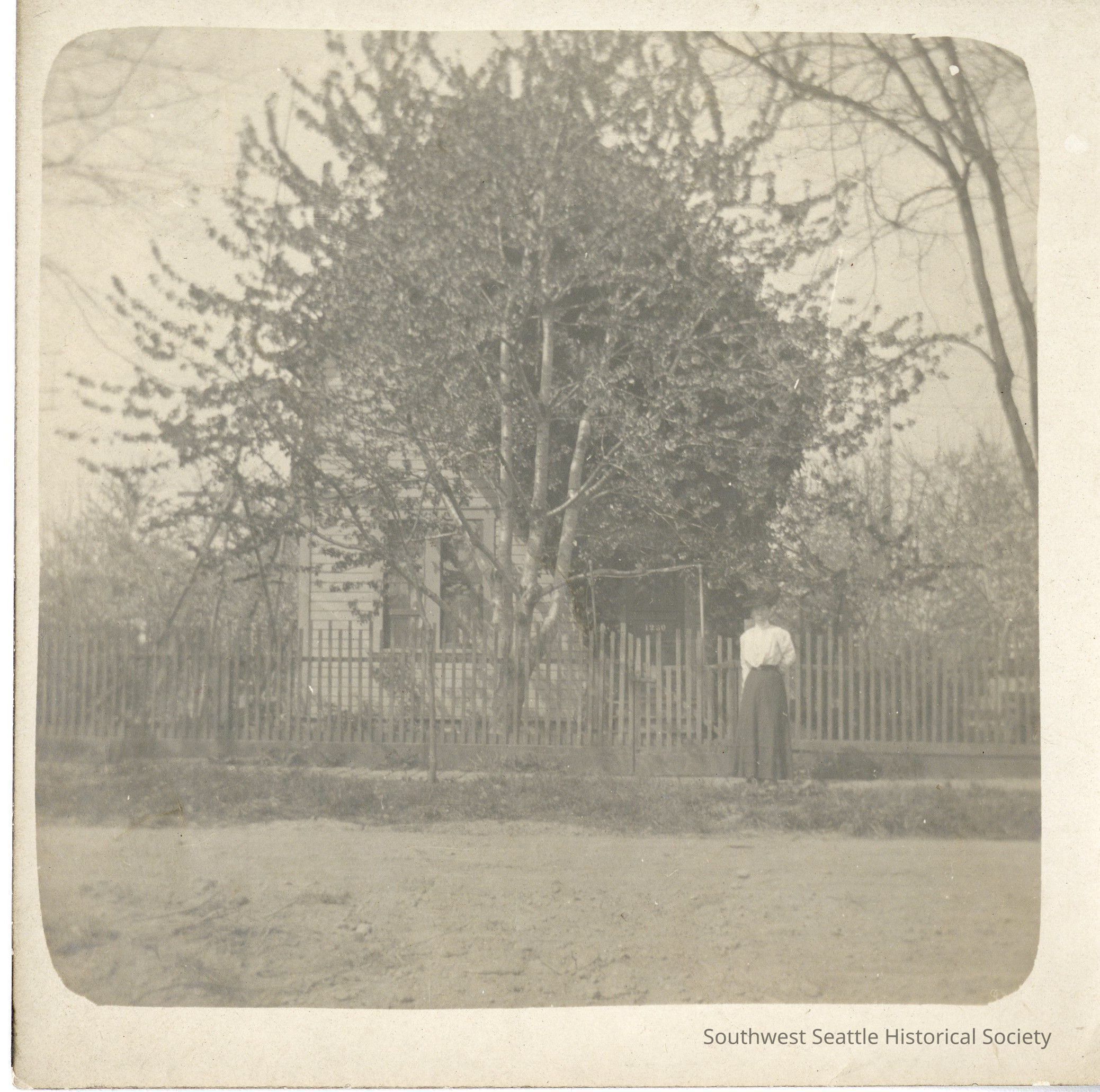 BW photo of Carlie Doty standing in front of South Park home, 1726 Cloverdale Dr