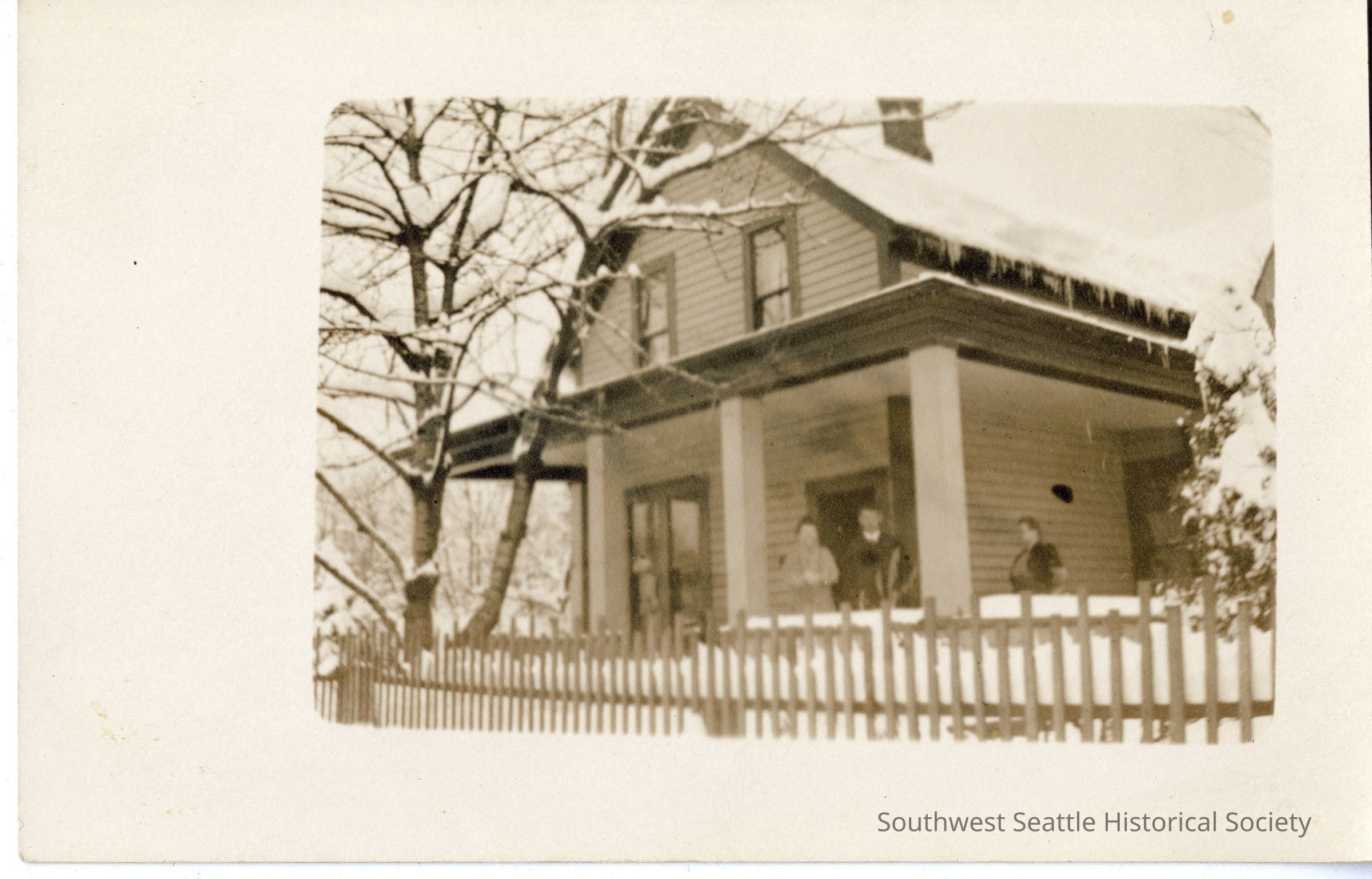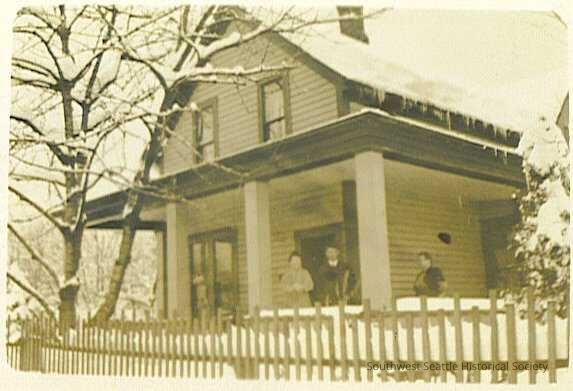"Aunt Ester, Uncle Frank and Grannie, 1916. On the porch of the 1st home we built in South Park. Frank had to tear it down as the earthquake had damaged it beyond repair. Frank was born in it"
