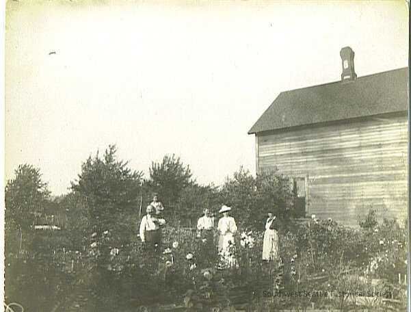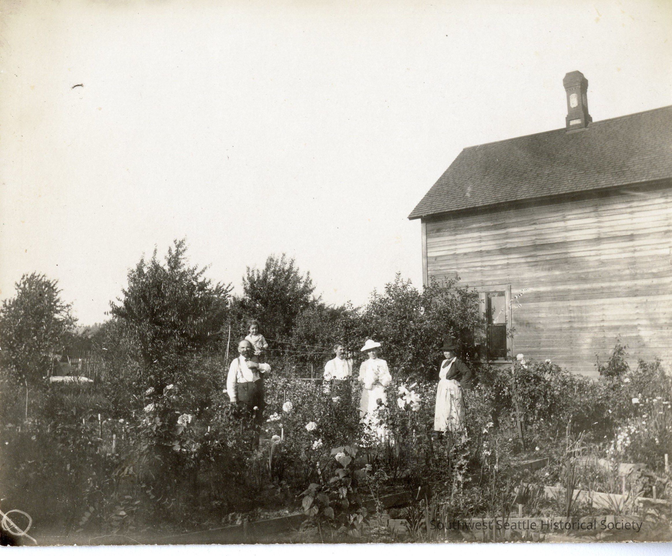 BW photo of Cushman-Doty family in yard/garden of South Park home "Pa with Frank on his shoulders and I and mother, about 1902" Frank 2yrs old, born on 3/11/1900