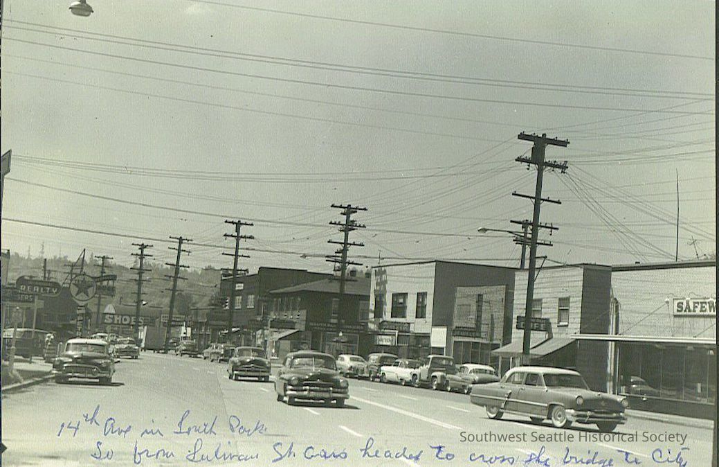 BW photo taken of 14th Ave in South Park, South from Sullivan St, cars headed to cross bridge to city. TAken July 28, 1954