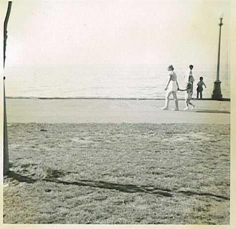 BW photo of Puget Sound from Alki Beach, people walking along boardwalk