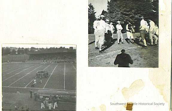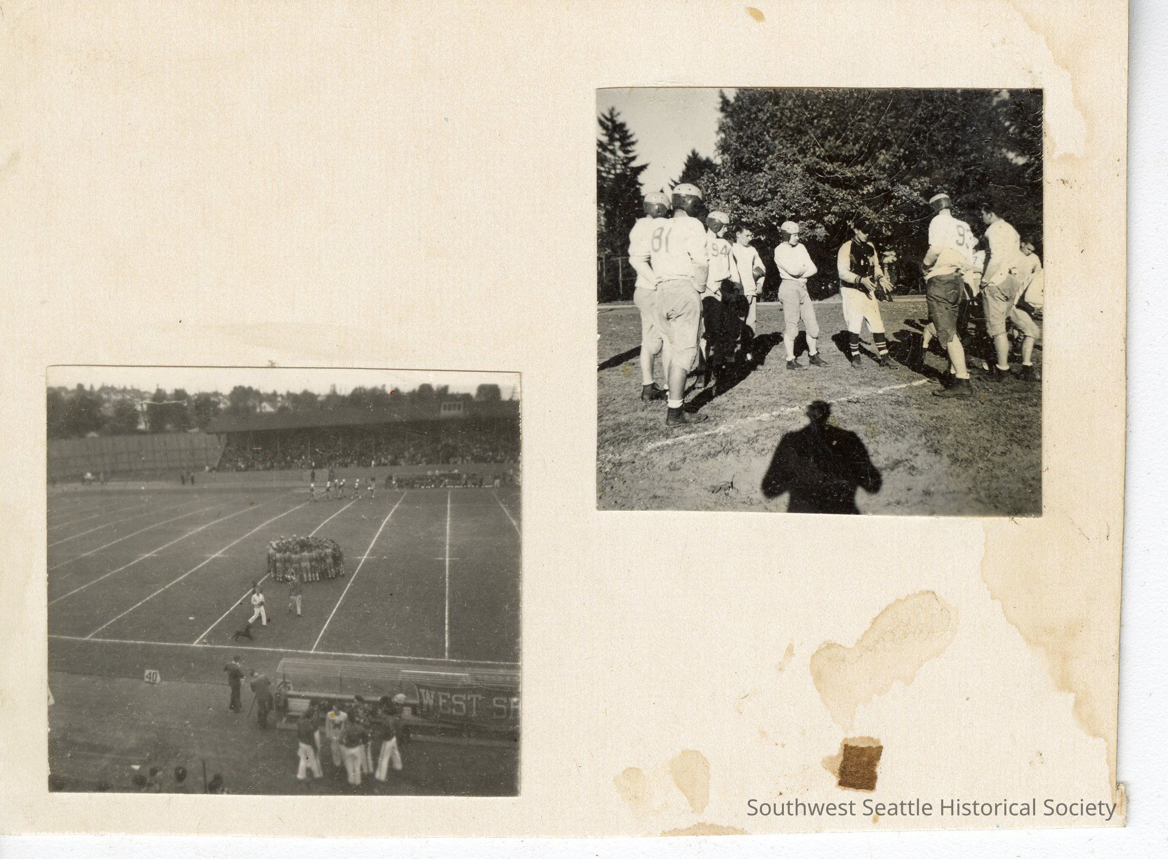 2 small photos of West Seattle High School football pasted to a piece of cardboard