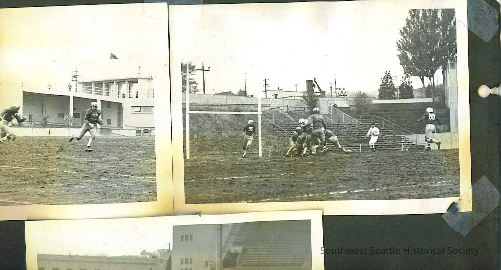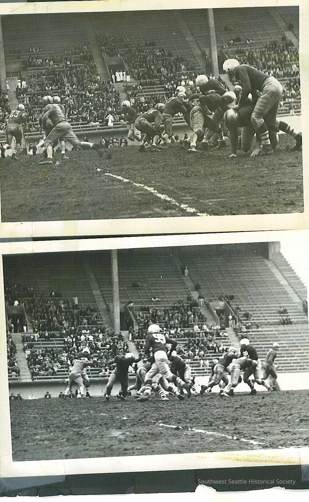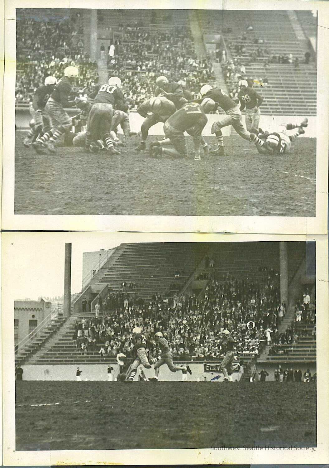 Loose scrapbook page. 7 photo of West Seattle High School football