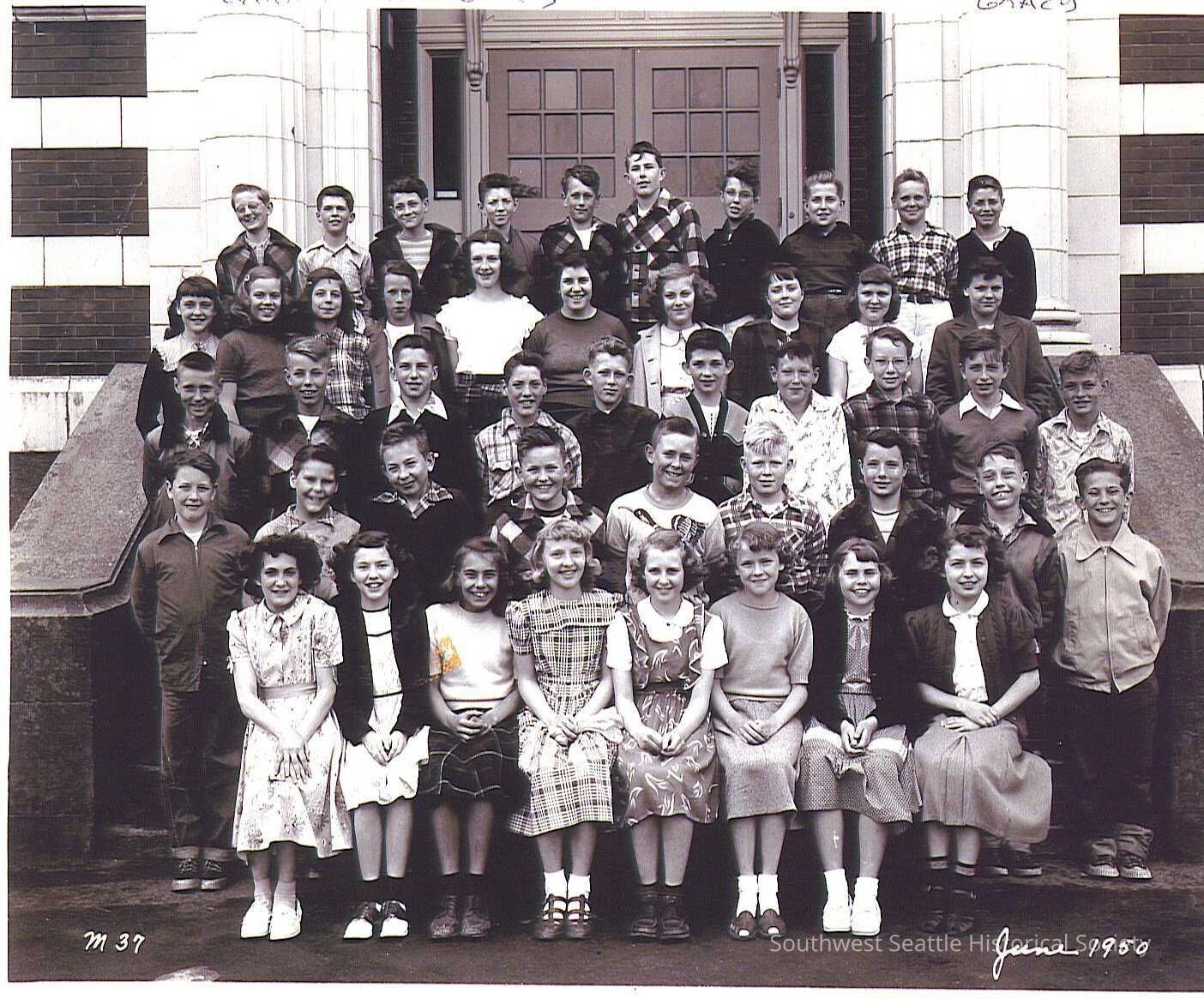 2 copies of BW photo. Alki ELementary School class photo June 1950 "Carr, Mynson, Goudy, Gracy"