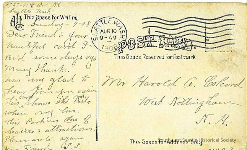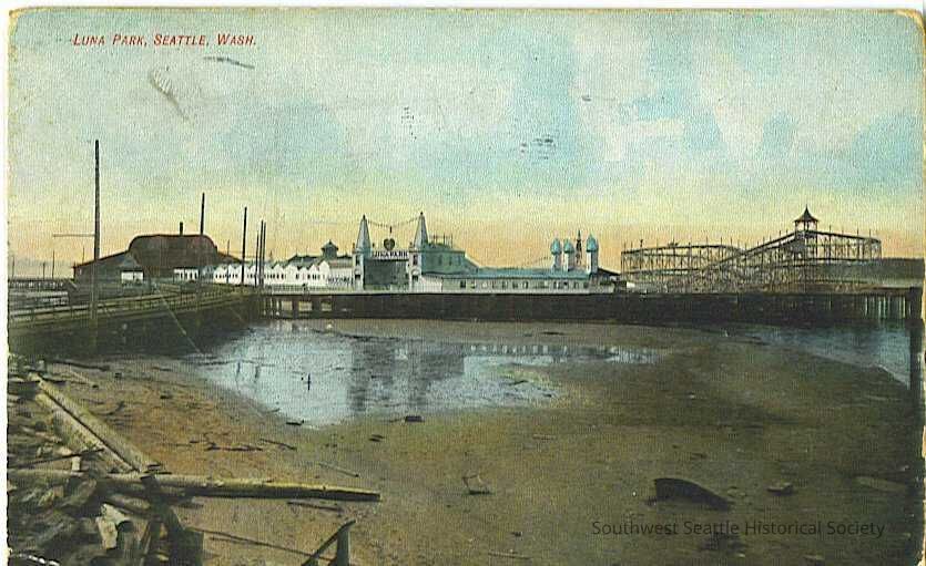 Color postcard - Luna Park Luna Park skyline at low tide. Postcard mailed August 10, 1908 to Mr. Harold Colcord, West Nottingham, NH Mailed from 2927 11th Ave NE