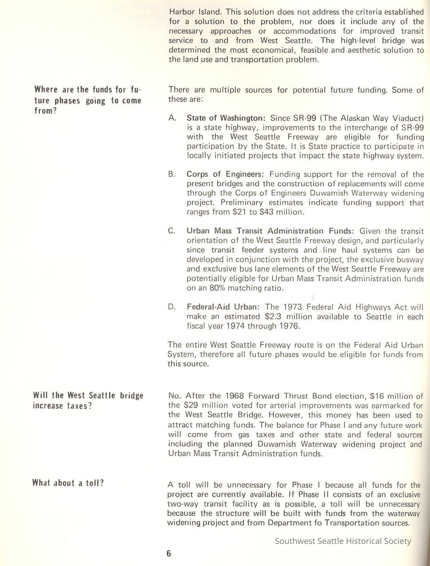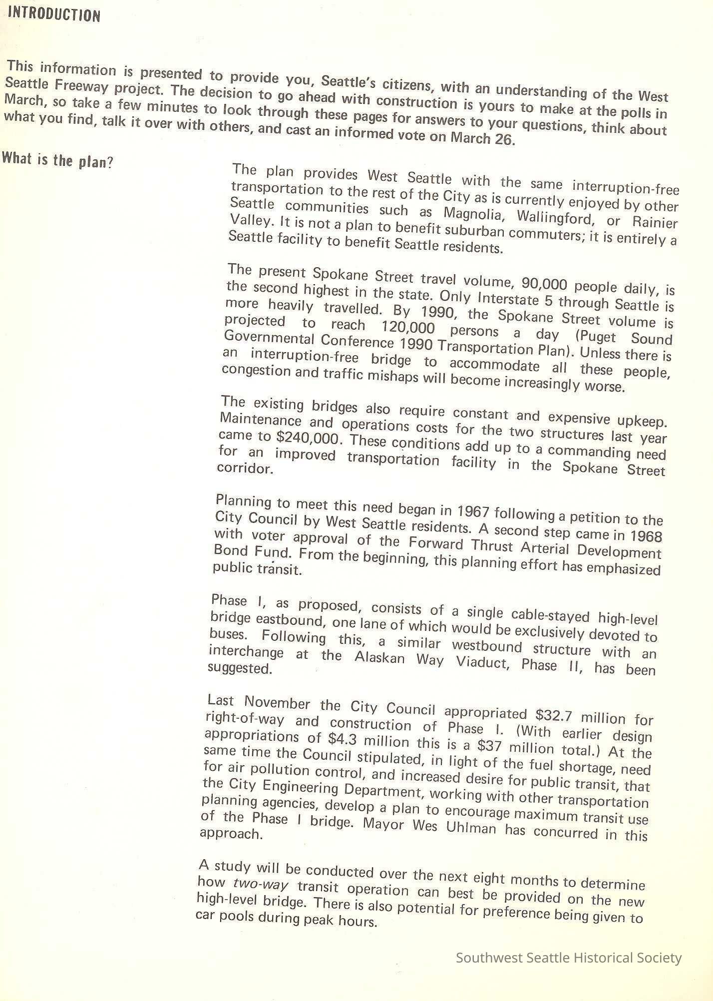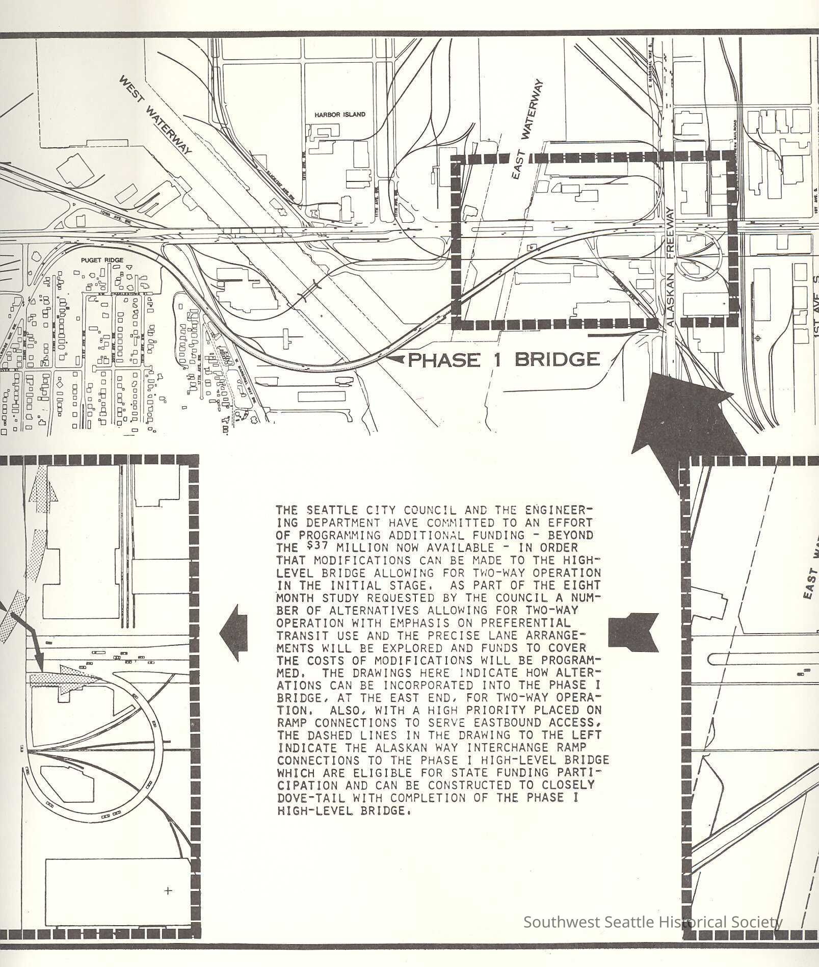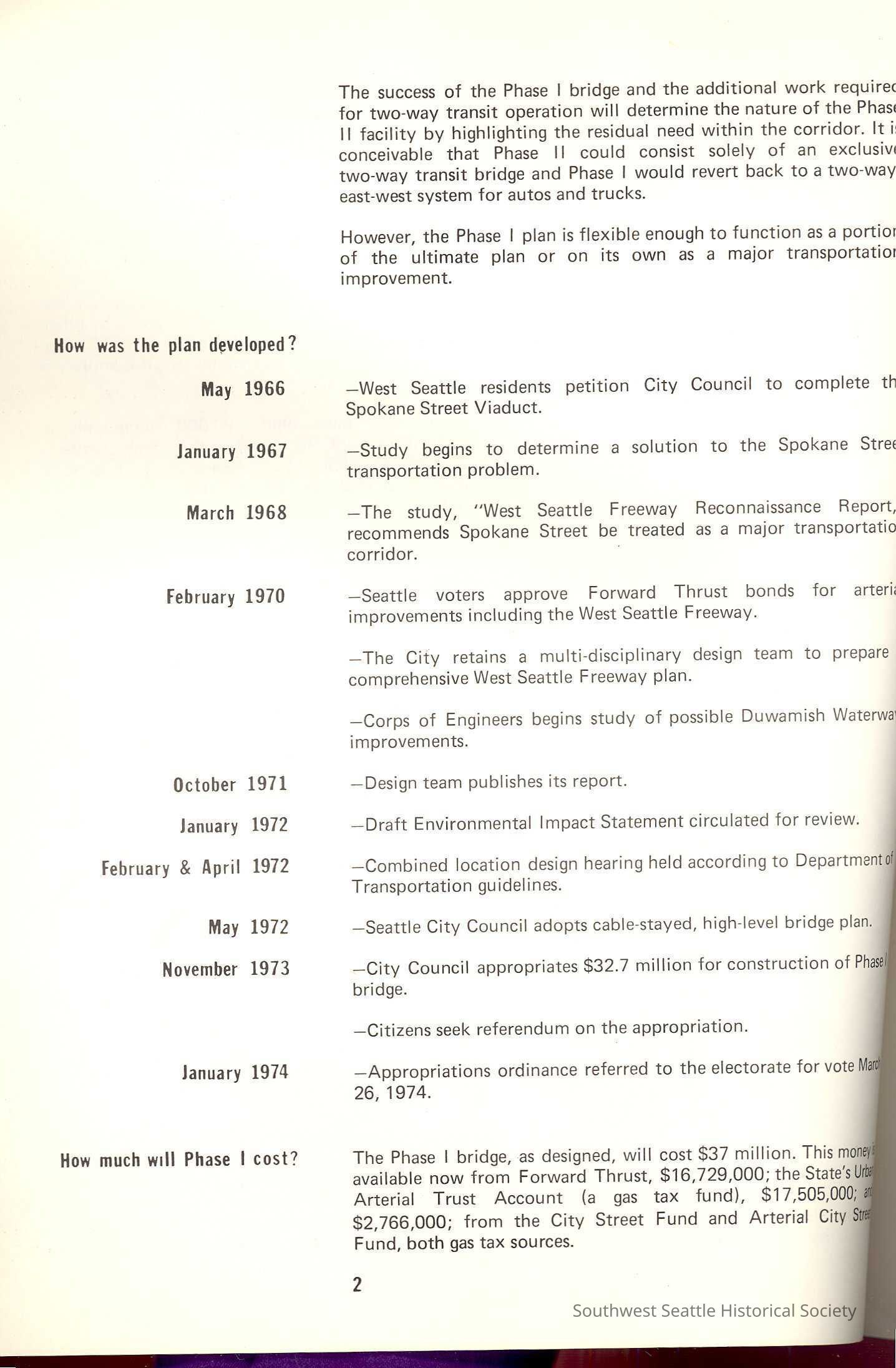 Information booklet; "fact sheet" on the West Seattle Freeway. Includes diagrams and information on construction and timeline of the bridge, 1974.Collection
