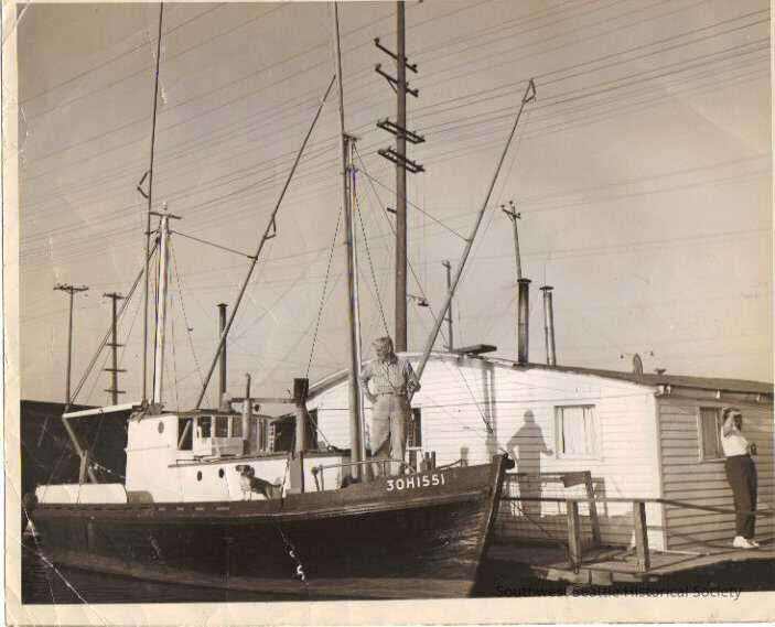 Small boat tied up next to a house - man and dog on boats, woman on dock Duwamish River, Riverside