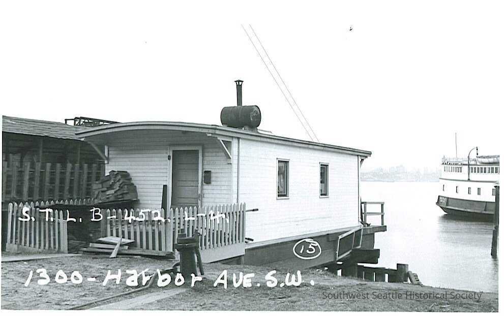 Houseboat at 1300 Harbor Ave SW, picket fence, bricks piled by door