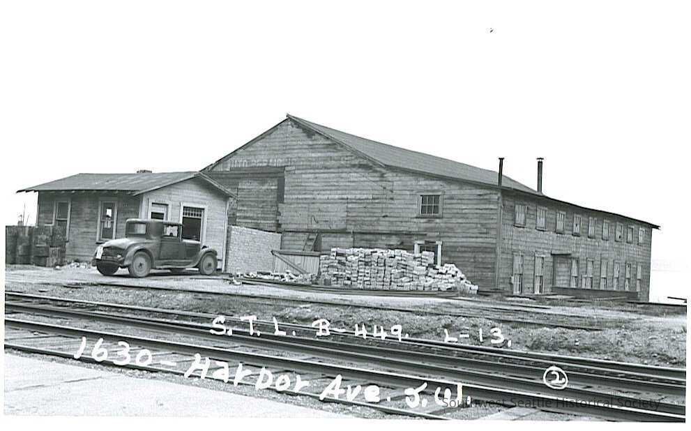 BW photo of 1630 Harbor Ave SW Brickyard, with old ford parked in the front