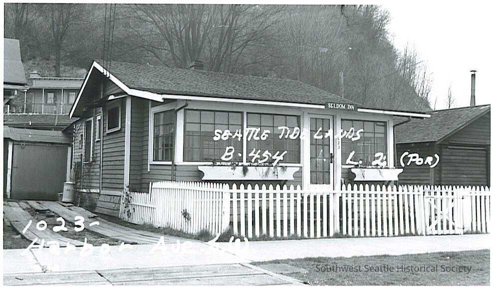 BW photo of 1023 Harbor Ave SW Small beach cottage "Seldom Inn' Photo labeled "Seattle tidelands"