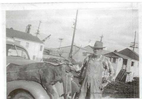 BW photo of _____ Vincent, standing in auto junkyard in Riverside. Dead carcass on hood of car.