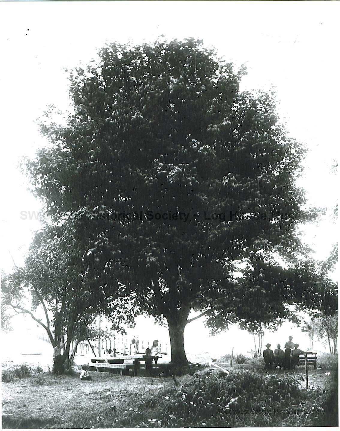 BW photo of Fauntleroy ferry dock, people in picnic area above dock. Big tree, walkway to ferry over water c. 1910's UW Special Collections #UW4631