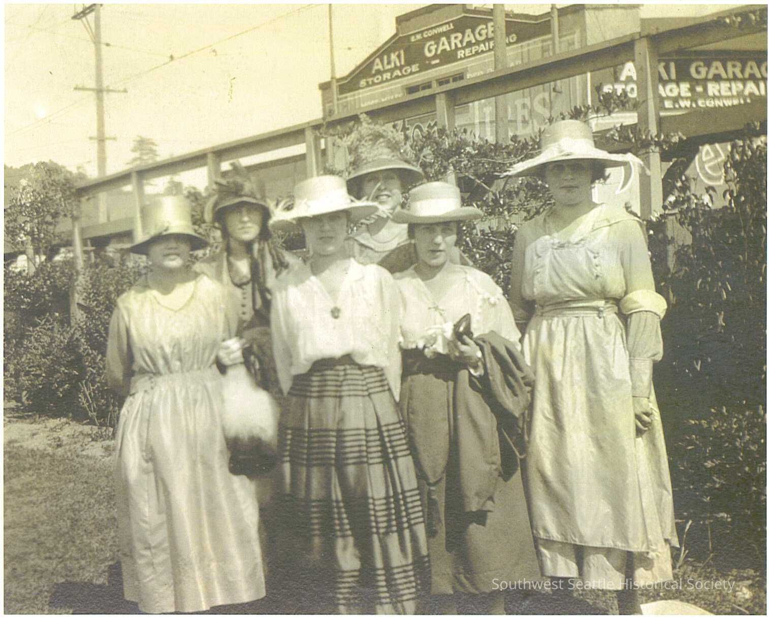 BW photo, 6 women standing in fron of EW Conwell's Alki Garage, Storage and Repair "Alki Beach L-R: Gertrude Hall, Evelyn Barnecur, ?, Margaret McBride, Lea Woodward, Lettie Barnecut"