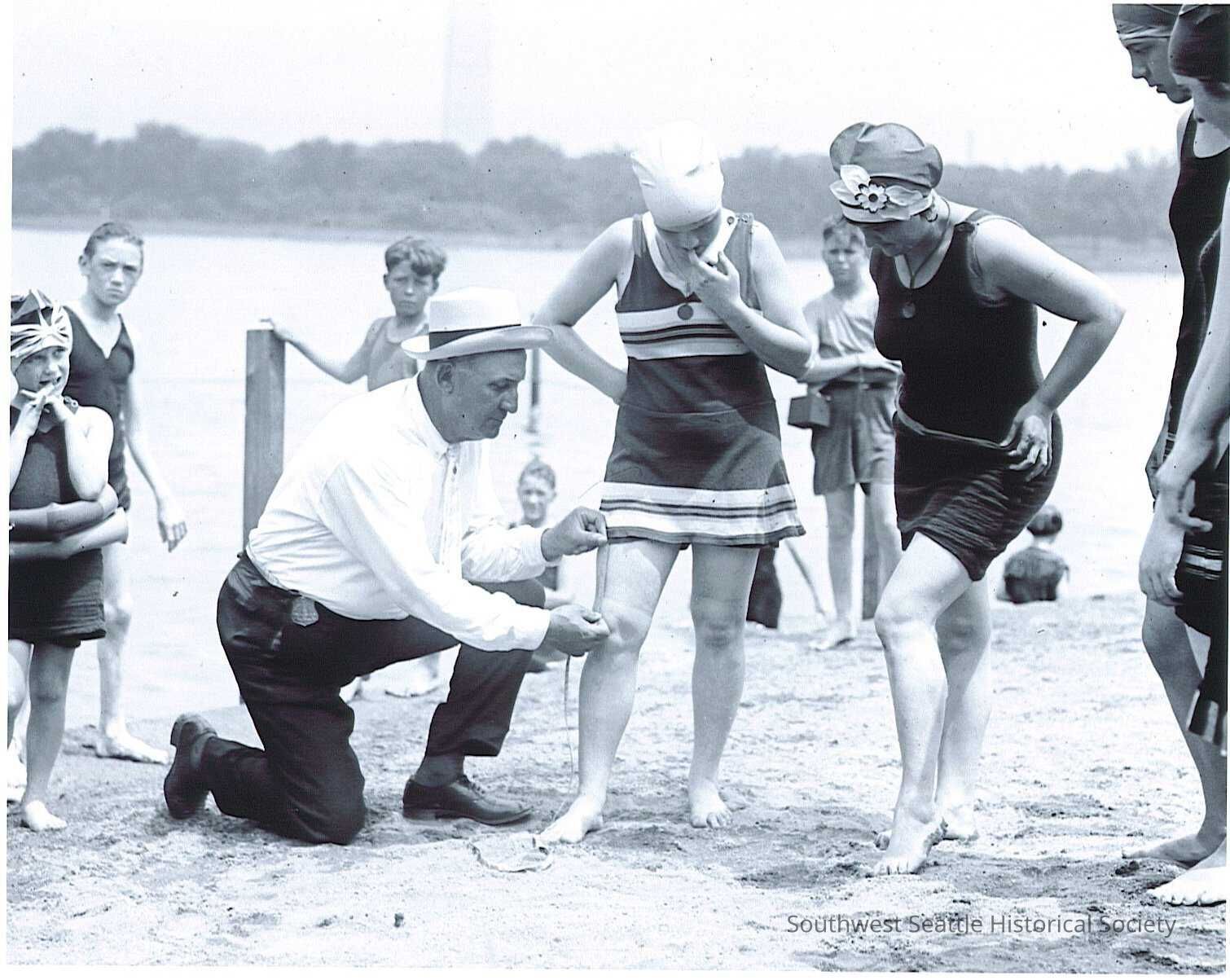 BW photo of two women in bathing suits, having the length measured with a tape measure by an official. Other younger swimmers in the backgroundCollection