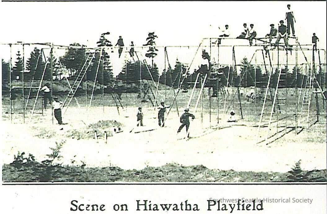 Print made from scan of photo in booklet, "1910 Beautiful West Seattle" "Scene on Hiawatha Playfield", children playing on swingsets and jungle gyms