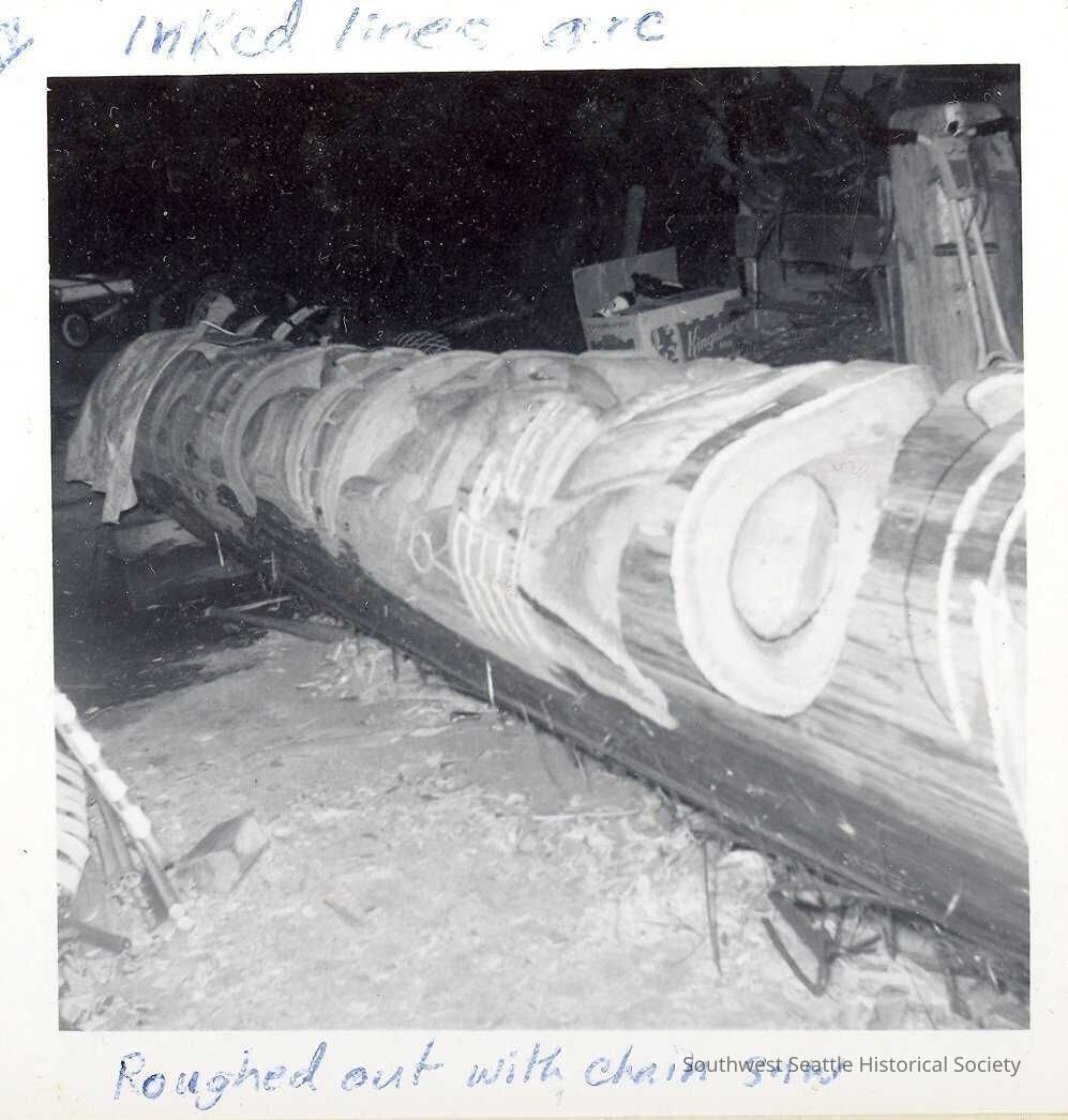 BW image of totem pole in progress - "inked lines are edged out with a chainsaw"