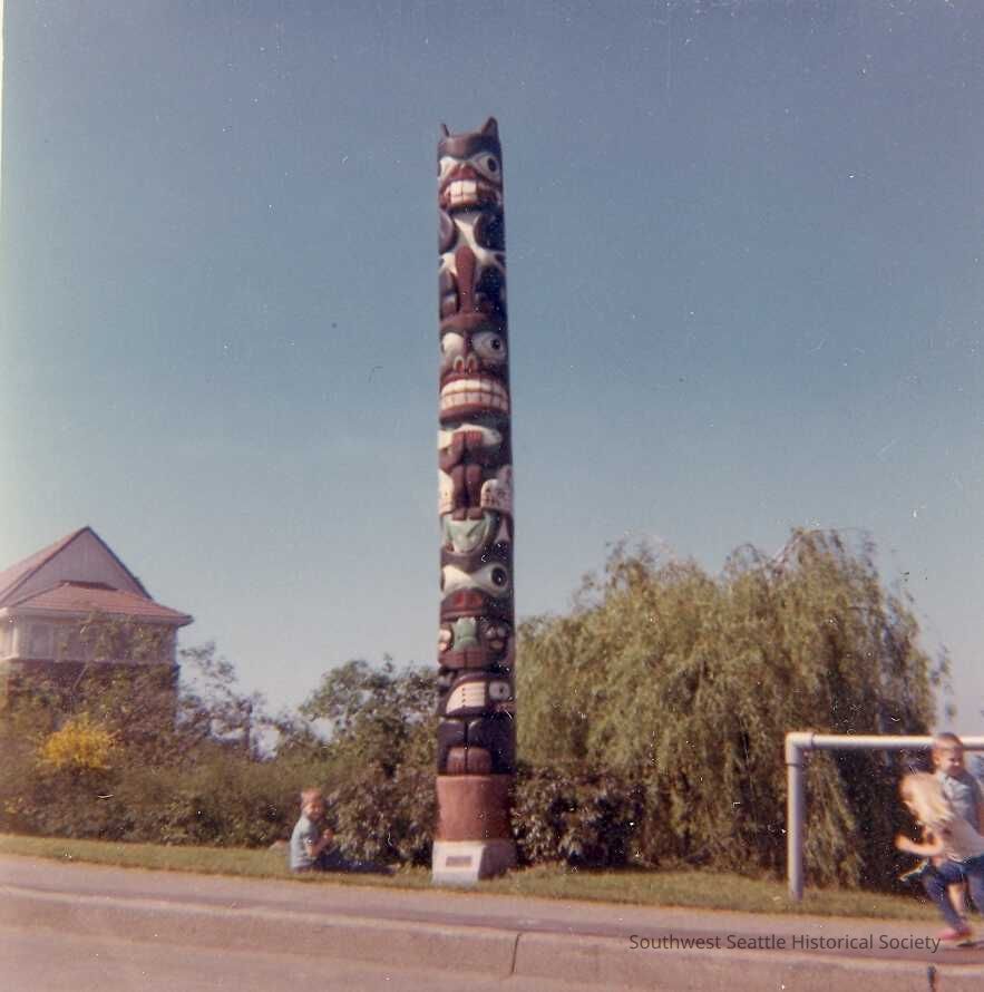 color image of totem standing at Belvedere Viewpoint Park, kids playing in the foreground