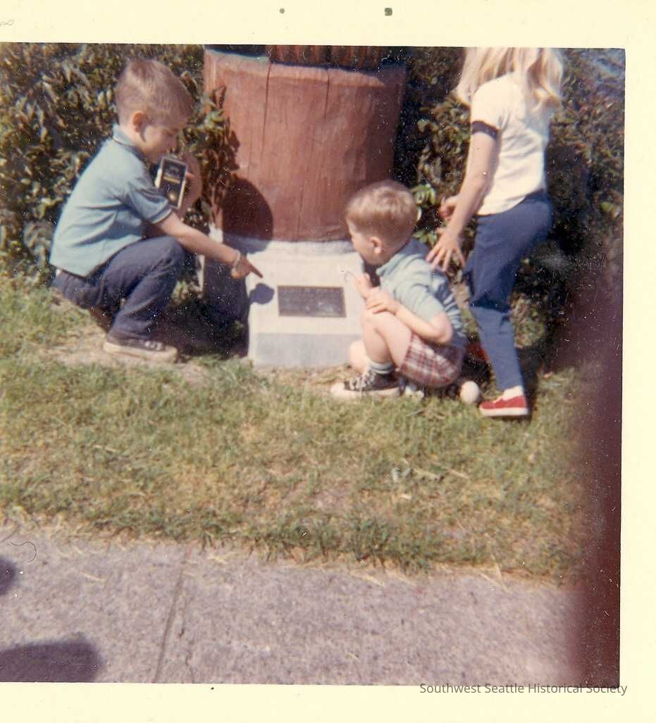Morgan and Fleischman children reading plaque at base of Admiral Way totem