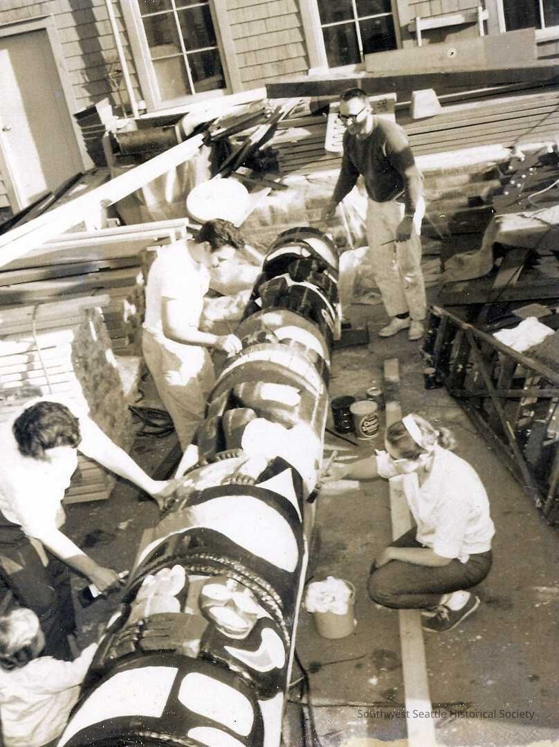 BW image - Fleischman and Morgan familes painting the totem in a driveway